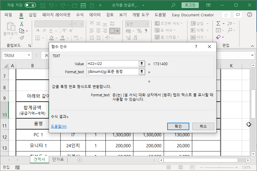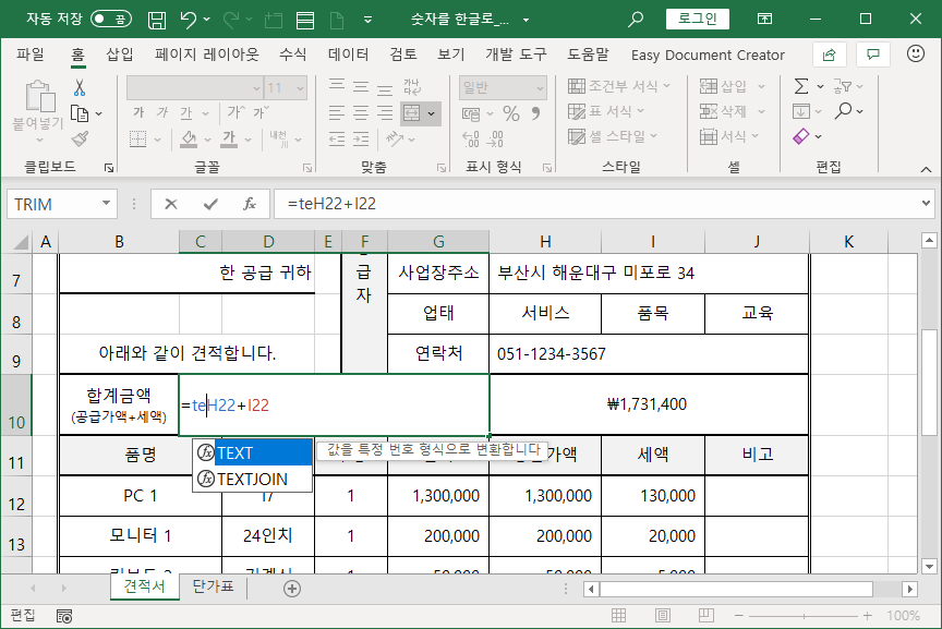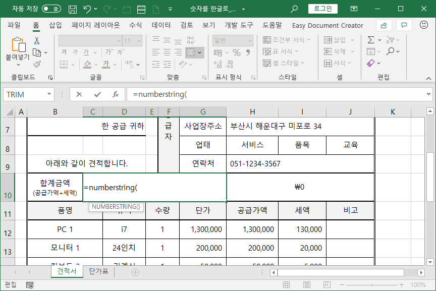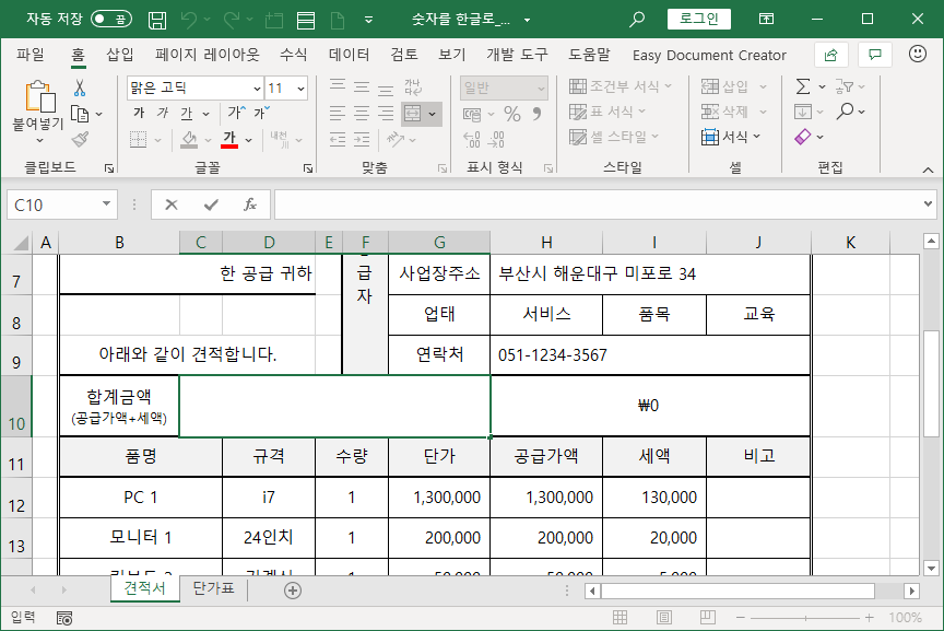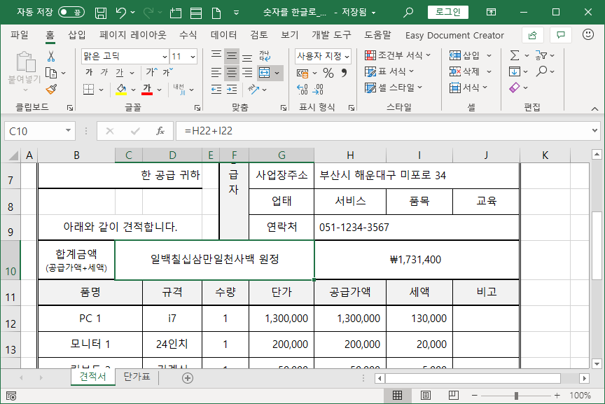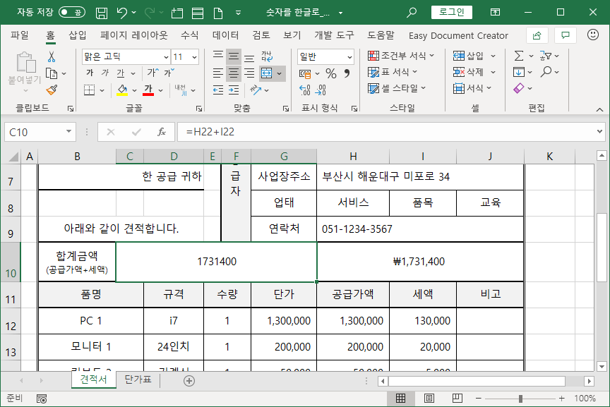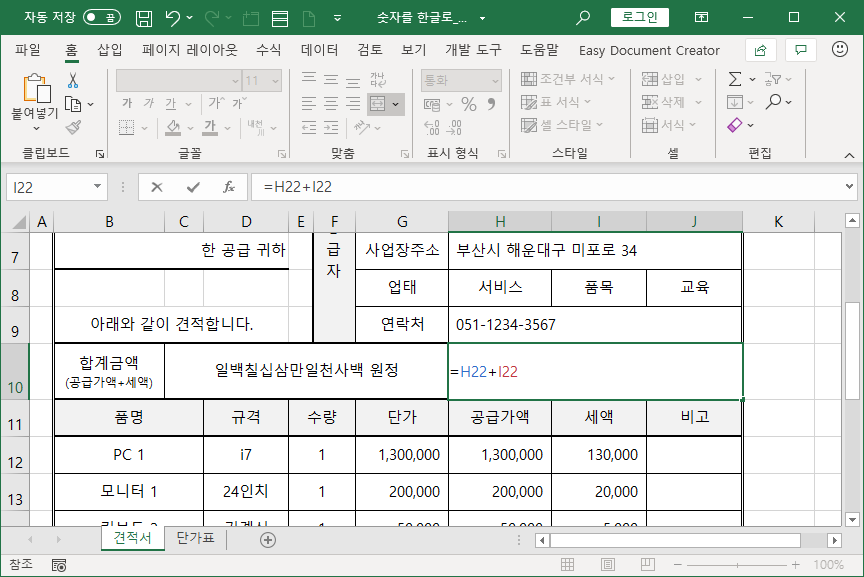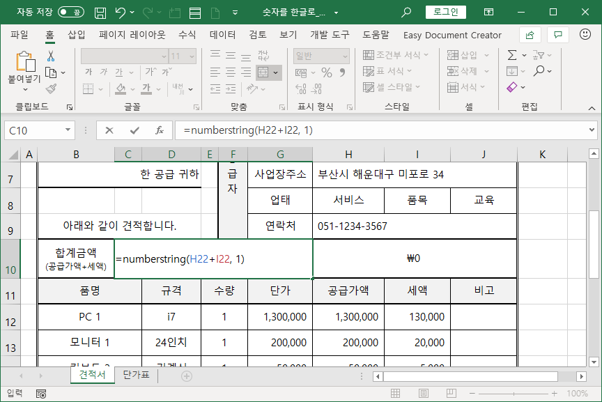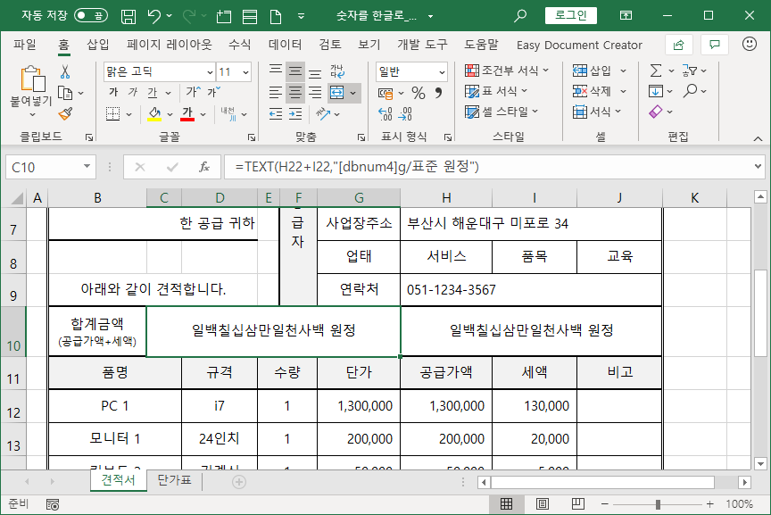 [C10] 셀과 [H10] 셀 두군데 합계금액을 나타내는데, [C10] 셀엔 한글로 나타내고, [H10] 셀엔 숫자로 나타냅니다.