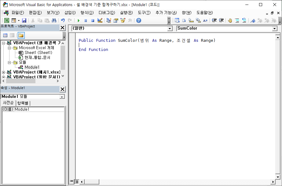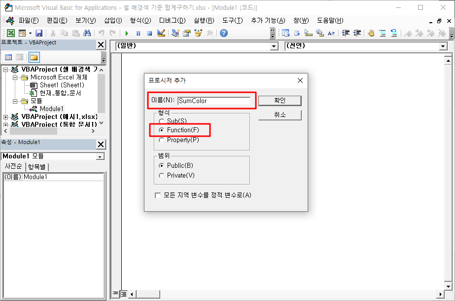 [프로시저 추가] 대화상자에서 새로 추가할 사용자 정의 함수 이름으로 SumColor를 적고, [형식]에서 Function을 선택한 뒤 [확인]을 누릅니다.