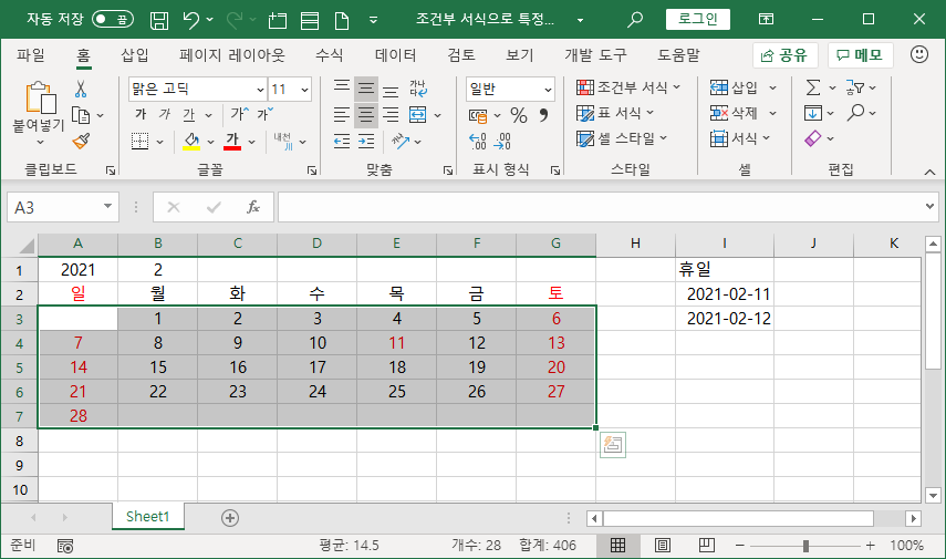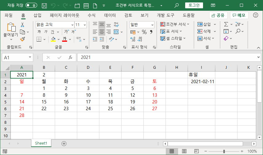 달력으로 나타낸 영역에서 사용자가 입력한 특정 날짜를 휴일에 해당하는 글꼴 색으로 조건부 서식을 이용해 나타내는 방법을 소개하겠습니다.