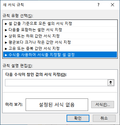 [새 서식 규칙] 대화상자에서 [수식을 사용하여 서식을 지정할 셀 결정]을 선택합니다.