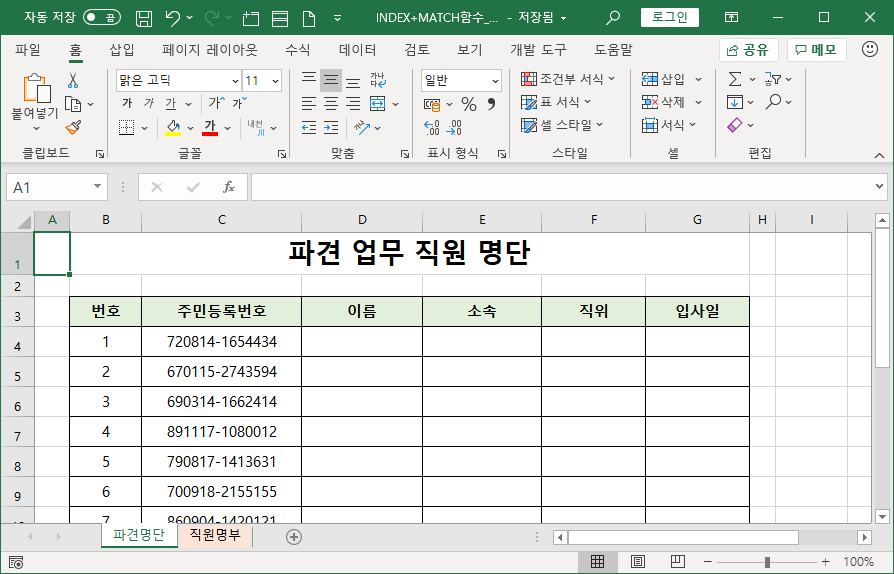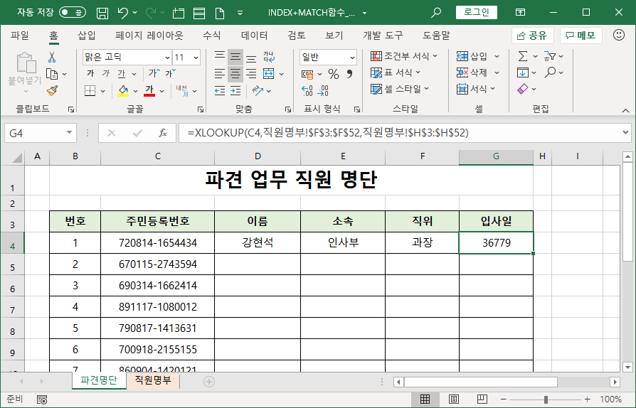 직원명부 시트를 보면 VLOOKUP 함수는 사용할 수 없다는 것을 알 수 있습니다.