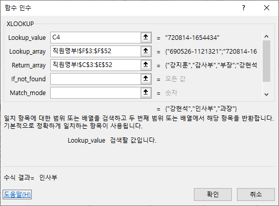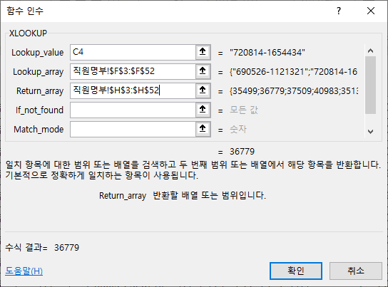 Return_array 인수에 참조표에서 이름이 입력되어 있는 열 범위 [직원명부!C3:C52]를 선택하고 절대 참조합니다.