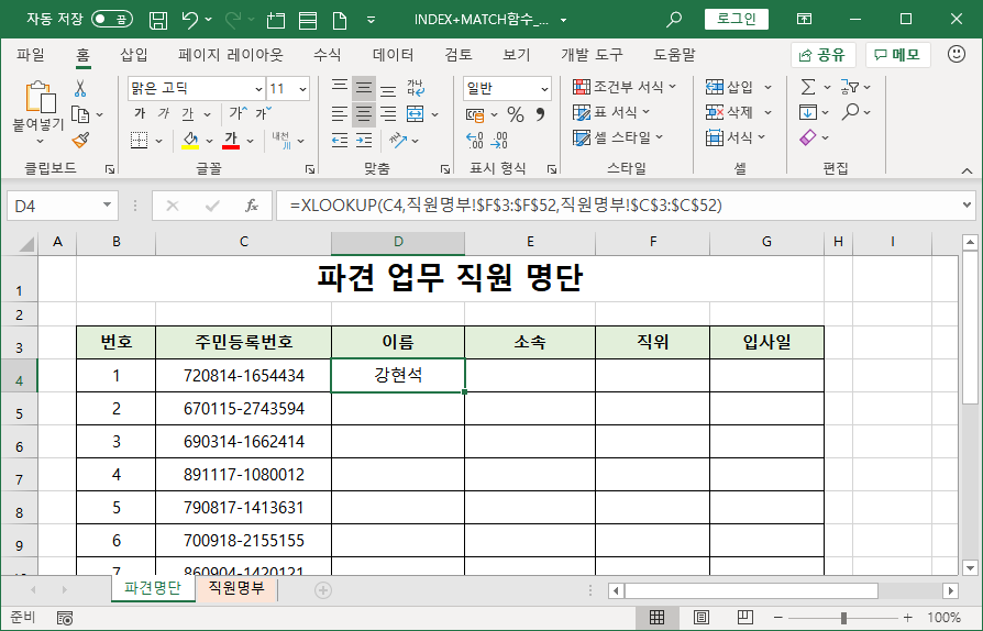 주민등록번호를 이용해 이름을 찾으려고 하는데, 직원명부 시트에서 주민등록번호 왼쪽 열에 이름이 있기 때문입니다.