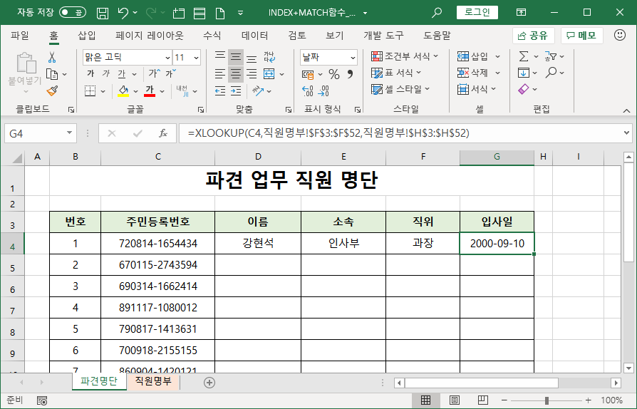 직원명부 시트에 직원 상세 정보가 입력되어 있습니다.