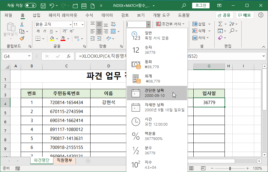[G4] 셀에 커서를 두고 [홈]-[표시 형식]-[간단한 날짜]를 선택합니다.