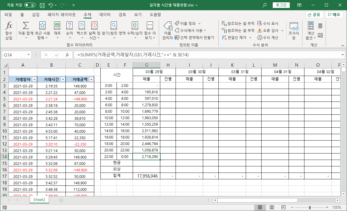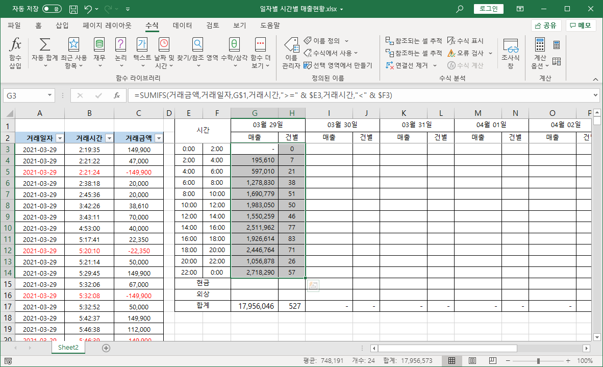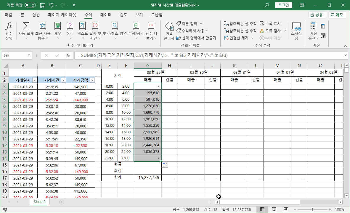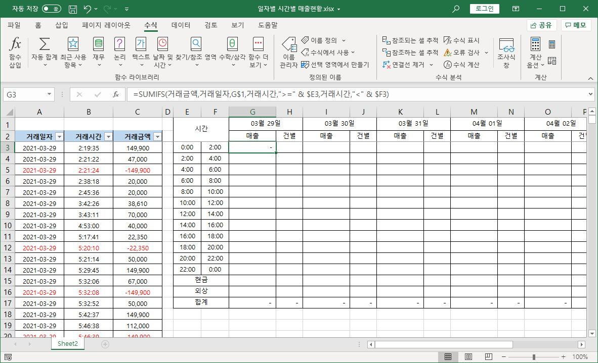 거래일자를 [G1] 셀에 있는 날짜와 같은지 비교하고, 거래시간을 [E3] 셀 시간보다 크거나 같고, [F3] 셀 시간보다 작은지 비교해서 매출 현황을 구하려고 합니다.