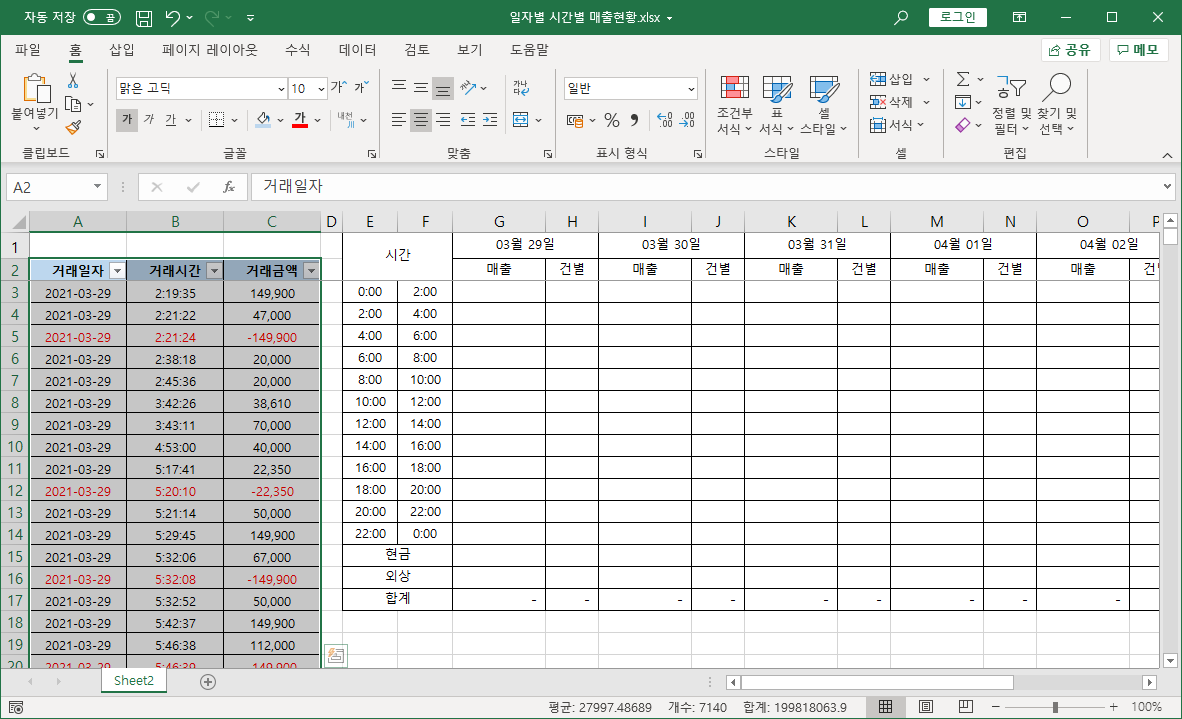 올바른 결과 값이 나타났는데, 3월 29일 0시부터 2시 사이엔 거래 내역이 없어 0입니다.
