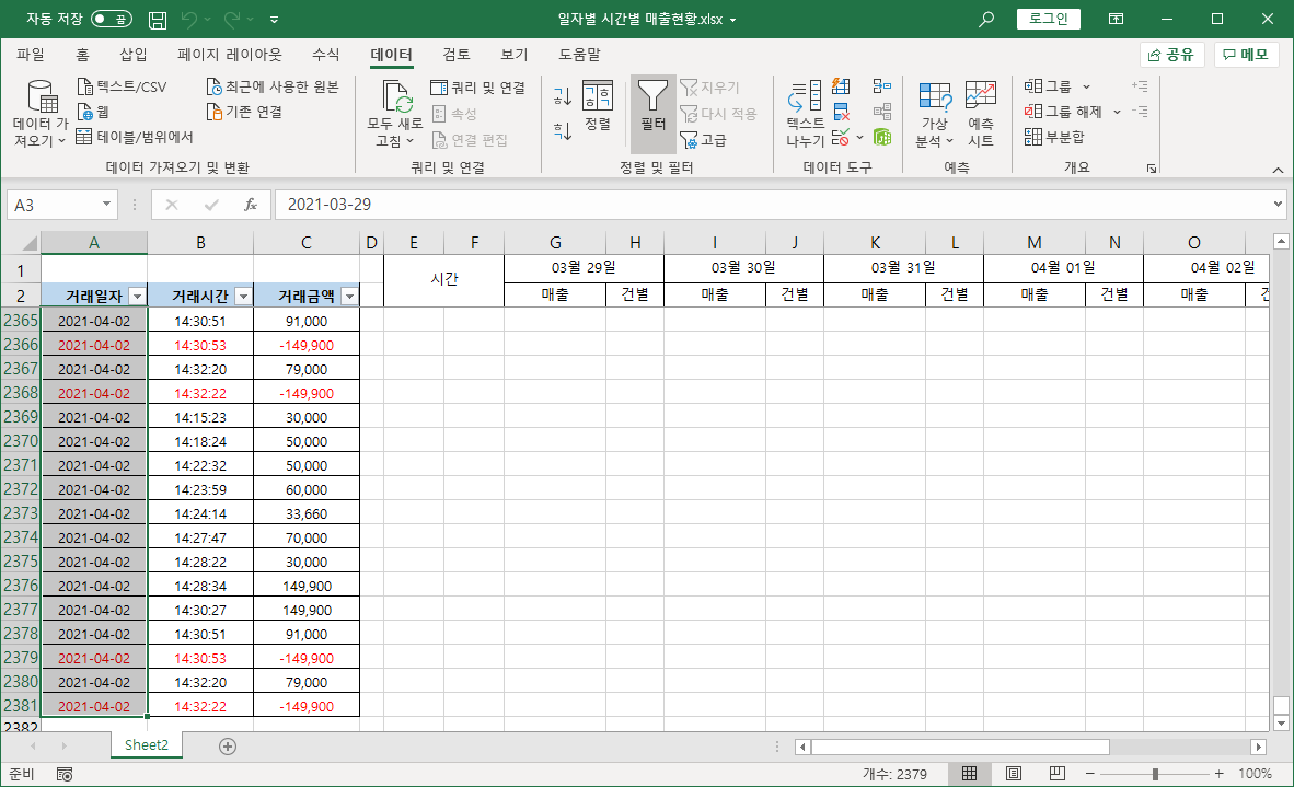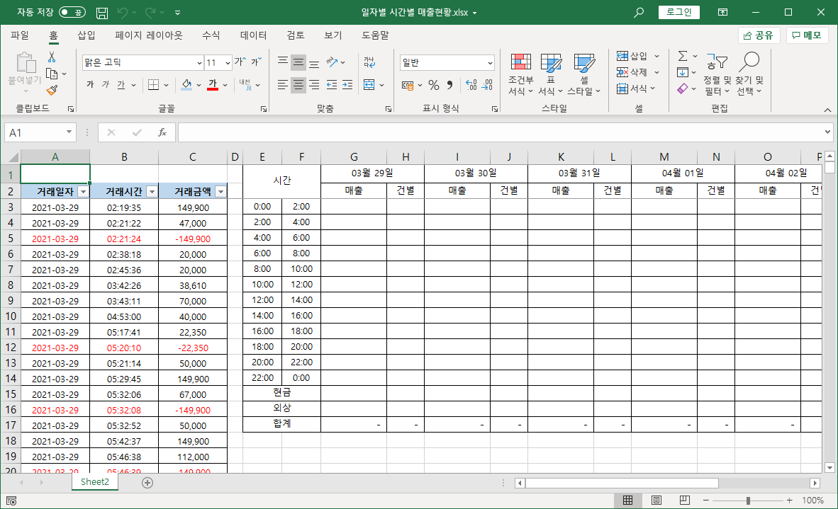 거래일자와 거래시간, 거래금액이 저장된 데이터가 있습니다.