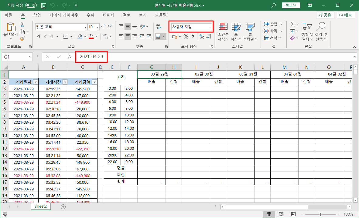 이 데이터를 일자별 시간별로 나누어 거래금액 합계와 거래건수를 나타내려고 합니다.