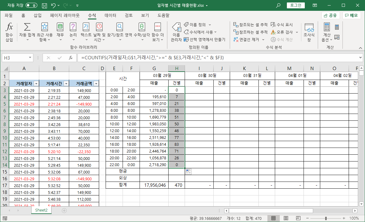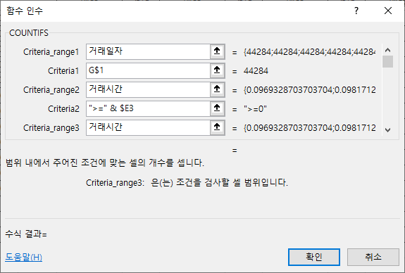 거래시간이 [E3] 셀의 0시보다 크거나 같고, [F3] 셀의 2시보다 작은 경우를 조건으로 지정했습니다.