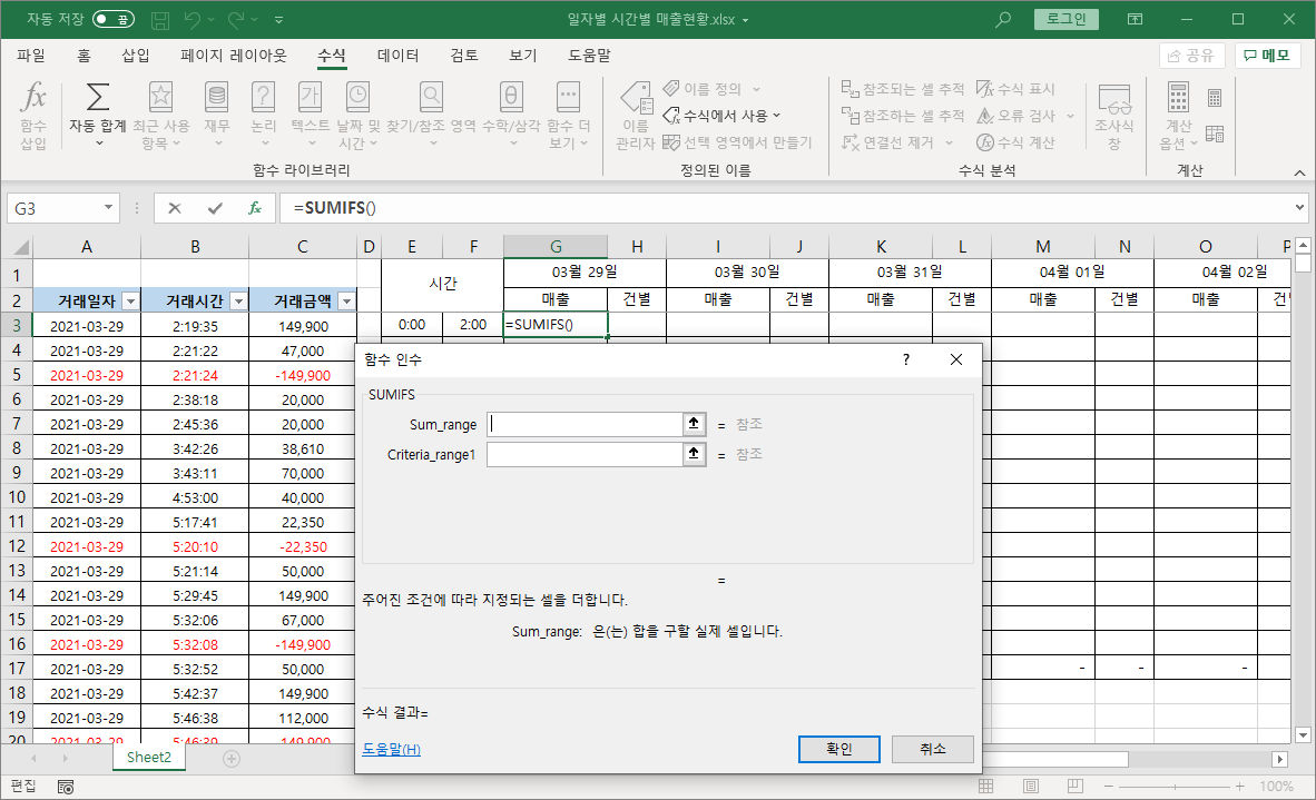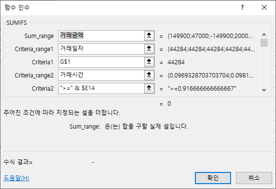 Sum_range 인수에 거래금액을 직접 입력하고, Criteria_range1 인수에 거래일자를 직접 입력합니다.