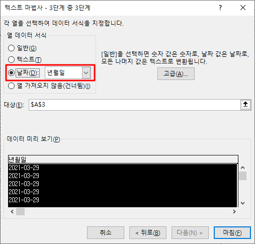 [텍스트 마법사] 1, 2단계를 기본값으로 [다음]을 눌러 넘기고, 3단계에서 [열 데이터 서식]에서 [날짜]를 선택한 뒤 마칩니다.