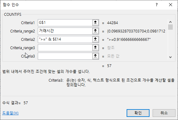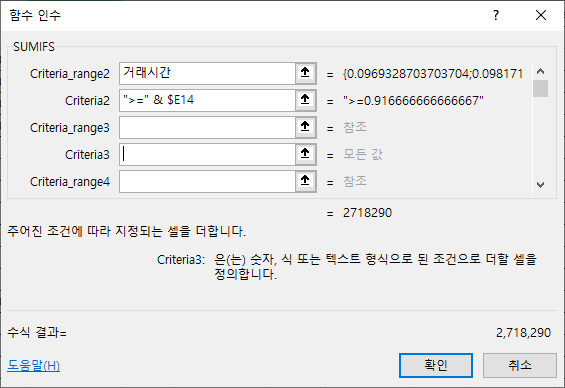 Criteria_range3 인수에 직접 거래시간을 입력합니다.