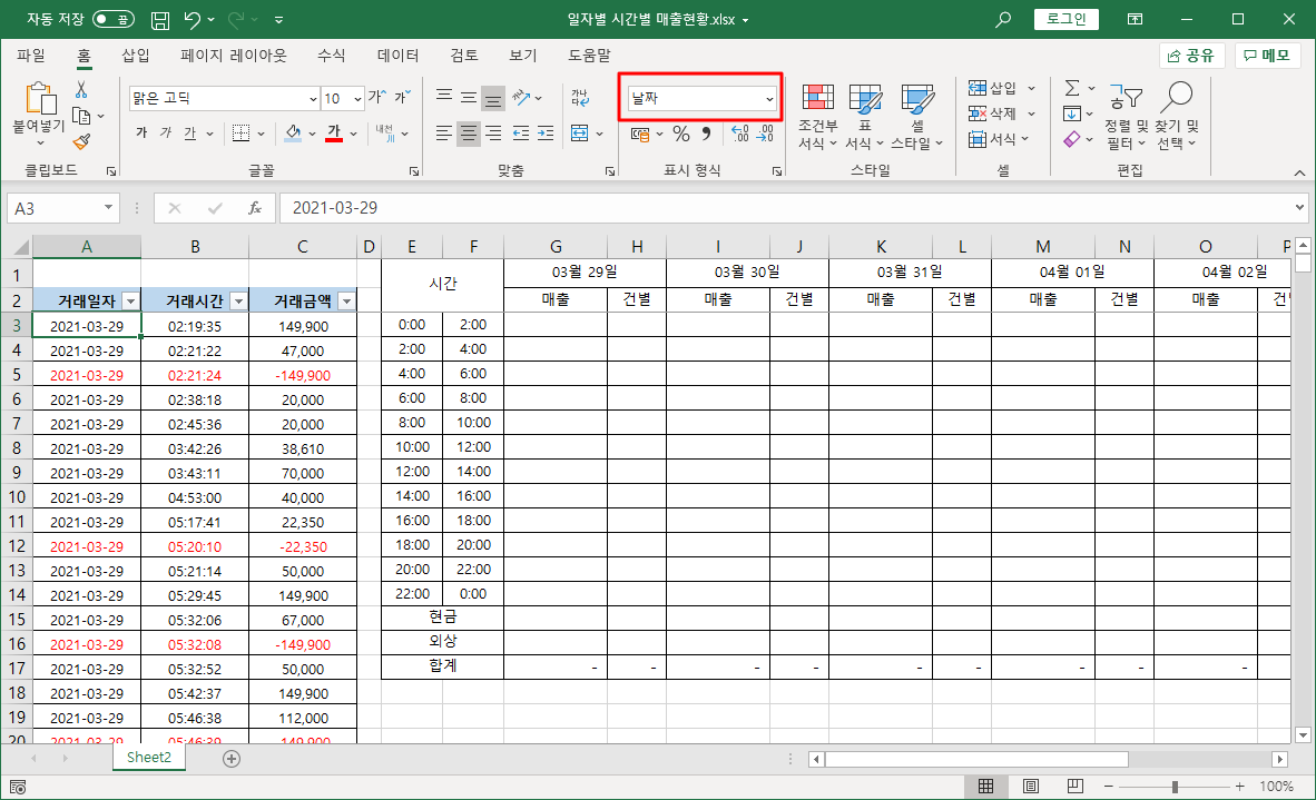 A열과 B열에 입력된 거래일자와 거래시간 데이터가 보기엔 날짜, 시간 형식인 것 같지만, [홈]-[표시 형식]에 [일반]으로 표시되는 문자 형식입니다.