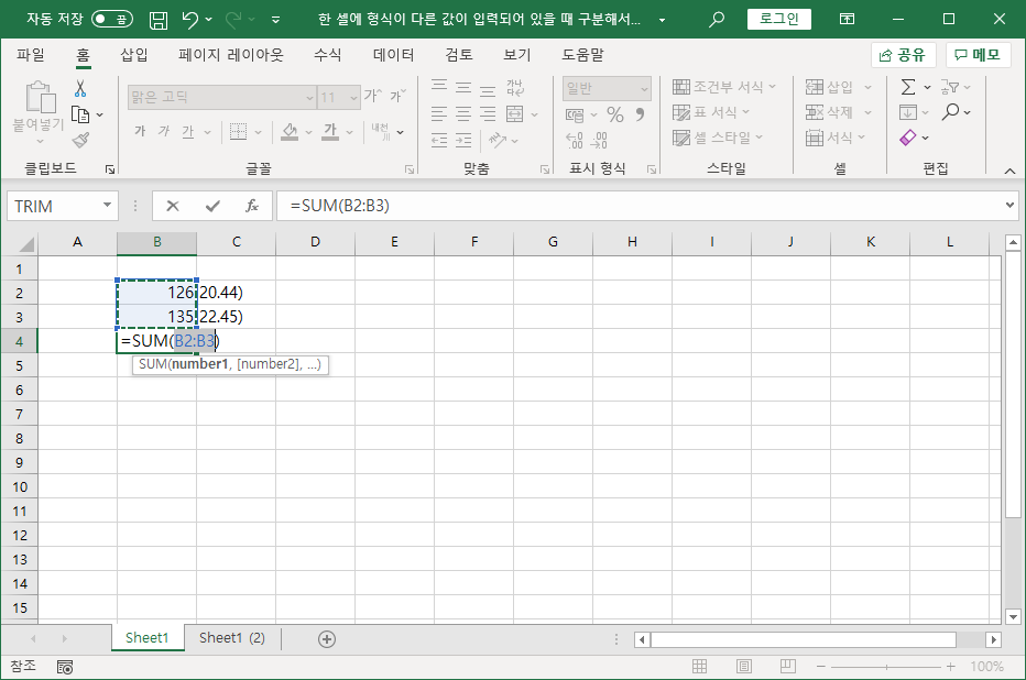예를 들어 [B2] 셀에 앞에는 정수 값이 입력되어 있고, 괄호 안에 백분율 값이 입력되어 있습니다.