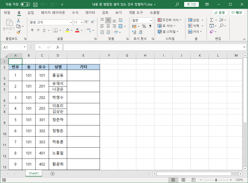 서식은 좀 있다 처리하기로 하고, 먼저 정렬하기 위해서는 병합이 해제되어 새로 표시된 빈 셀을 채워야 합니다.