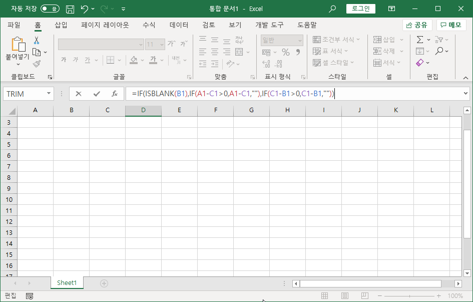 D1 셀 =IF(ISBLANK(B1),IF(A1-C1>0,A1-C1,""),IF(C1-B1>0,C1-B1,""))