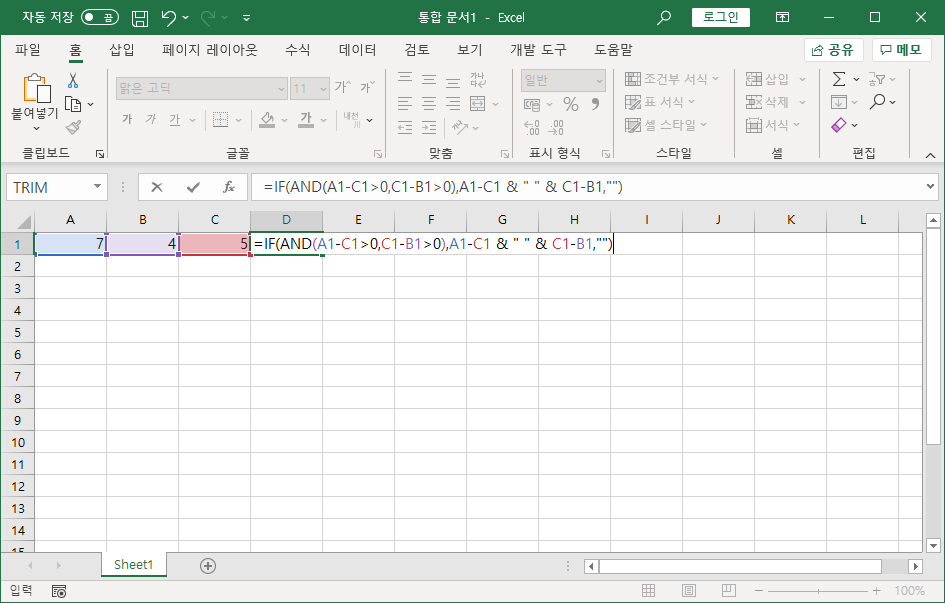 즉 D1의 수식은 A1(7) - C1(5)=2(양수) 와 C1(5) - B1(4)=1(양수) , E1의 수식은 7 - 9 = - 2(음수), 5 - 7 = - 2(음수)