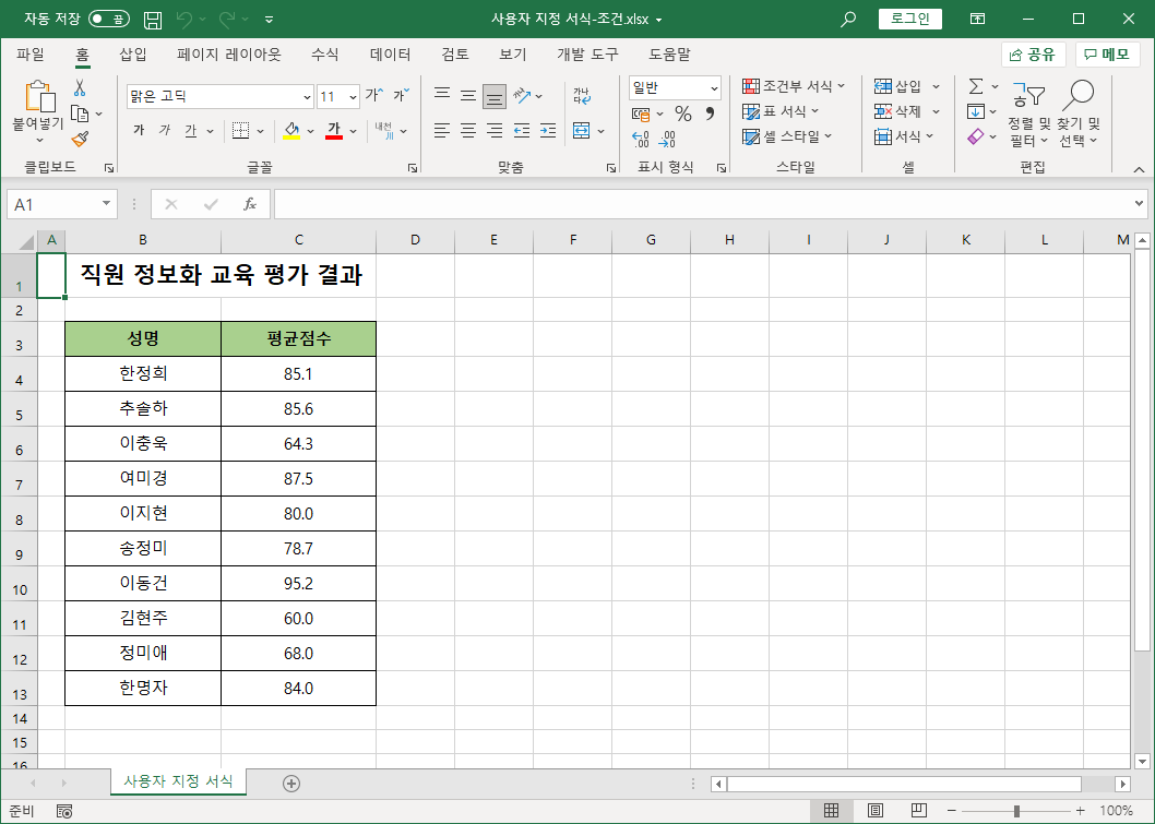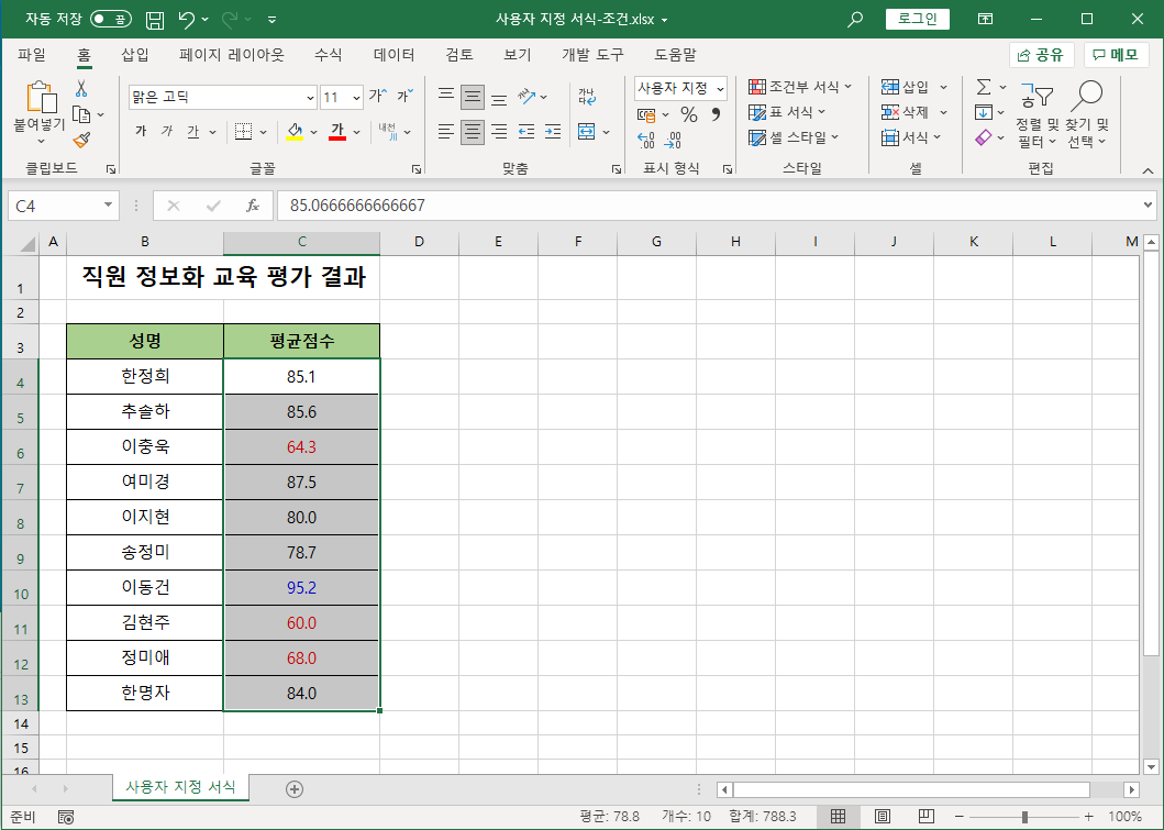조건을 수정해서 90점 이상은 '파랑', 70점 미만은 '빨강'으로 나타내고, 그 외는 원래대로 나타내겠습니다.