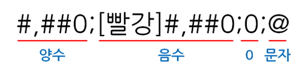 색상을 먼저 표시하고, 대괄호에 조건을 적습니다. 세미콜론을 입력한 뒤 조건에 해당하지 않는 경우에 나타낼 형식을 적습니다.