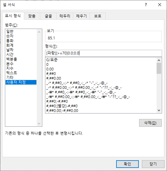 사용자 지정 서식에서 조건을 지정하는 방법은 단순합니다.