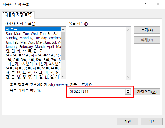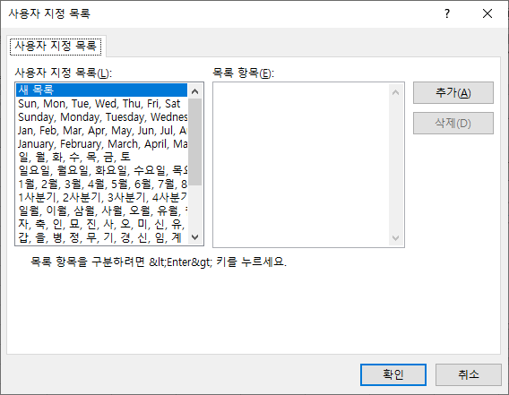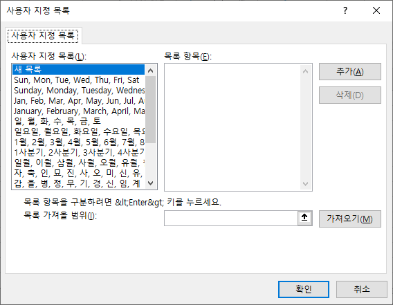 두번째 방법으로 사용자 지정 목록 대화상자를 실행하면 [목록 항목]에 하나씩 입력해서 추가하는 방법만 제공합니다.