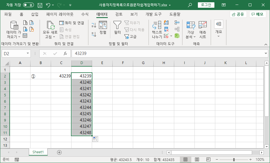[D2] 셀에 43239를 직접 입력한 뒤 채우기해서 43248까지 나타냅니다.