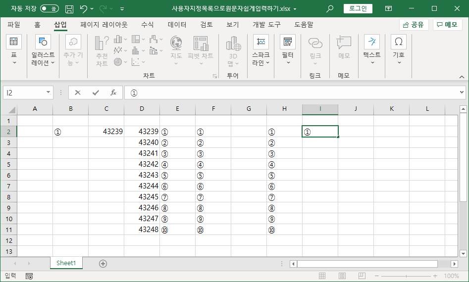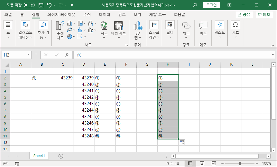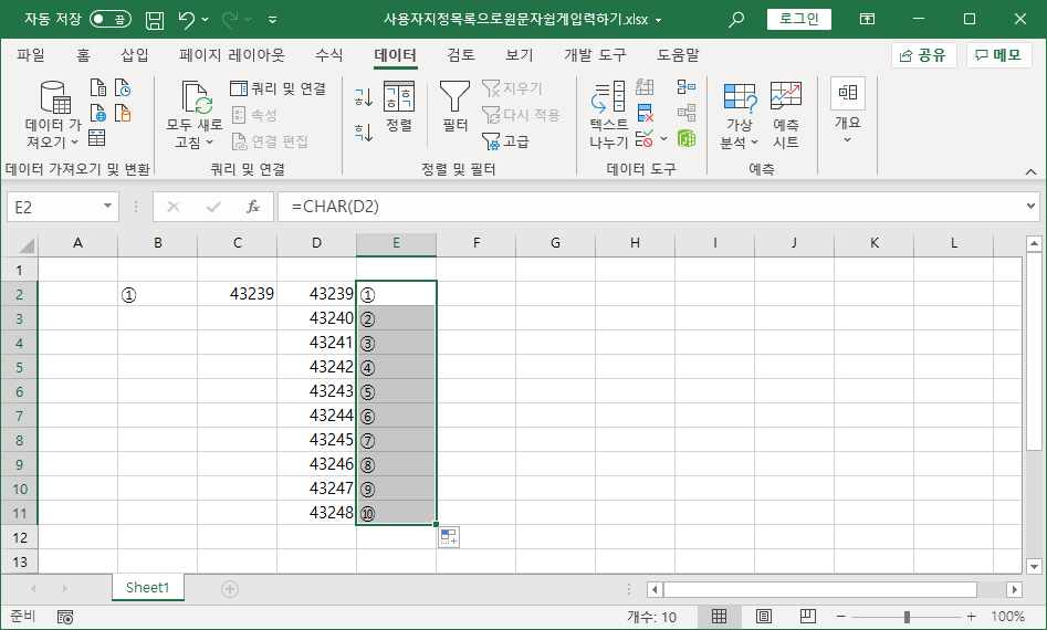 [E11] 셀까지 채워서 원문자 ⑩까지 나타냅니다.
