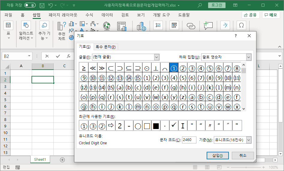 제대로 동작하는 지 확인하기 위해 [H2] 셀을 선택하고 [삽입]-[기호]를 선택하고 원문자 ①을 나타냅니다.