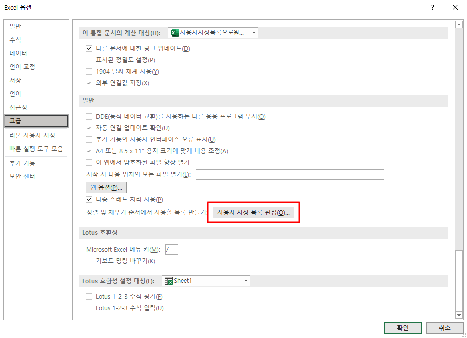 첫번째는 [파일]-[옵션]-[고급]-[사용자 지정 목록 편집]을 눌러 등록하는 방법입니다.