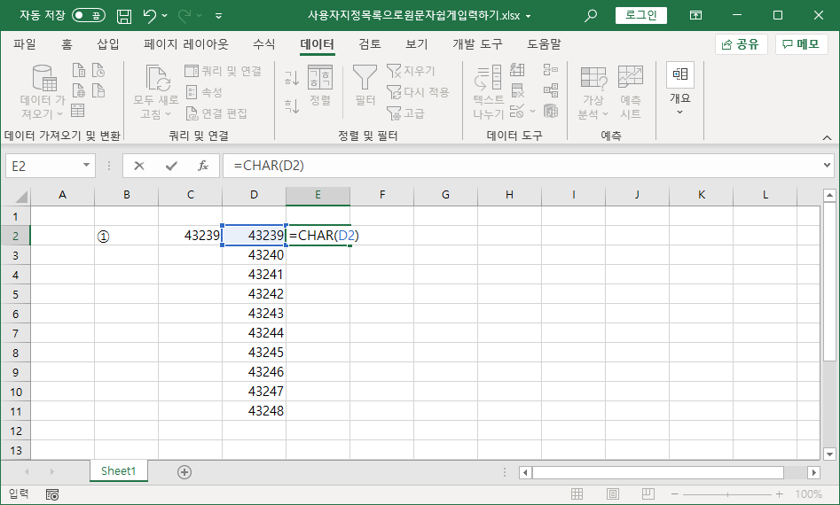 E열에 표시되는 원문자는 함수로 나타낸 것이라 사용자 지정 목록에 등록할 수 없어 F열에 값으로 붙여넣기한 것입니다.