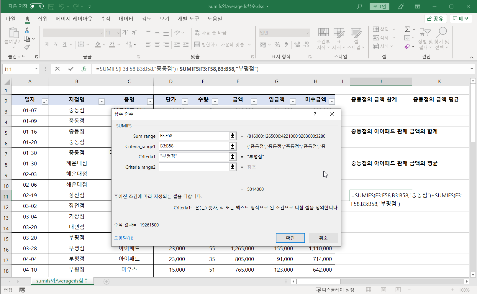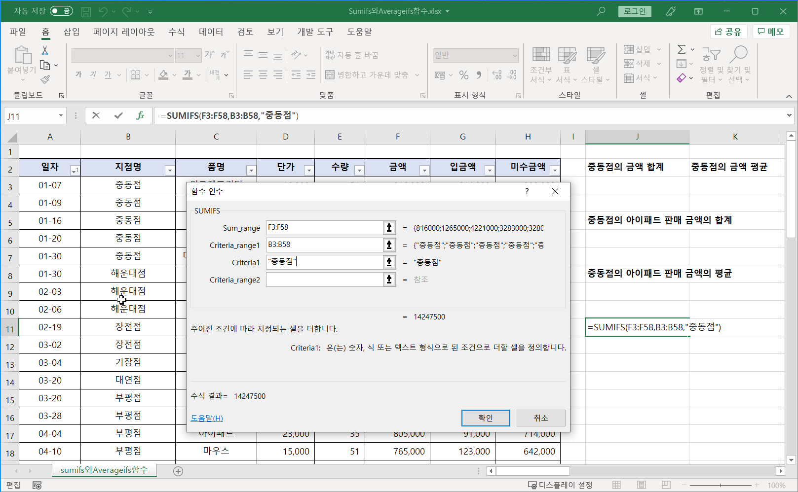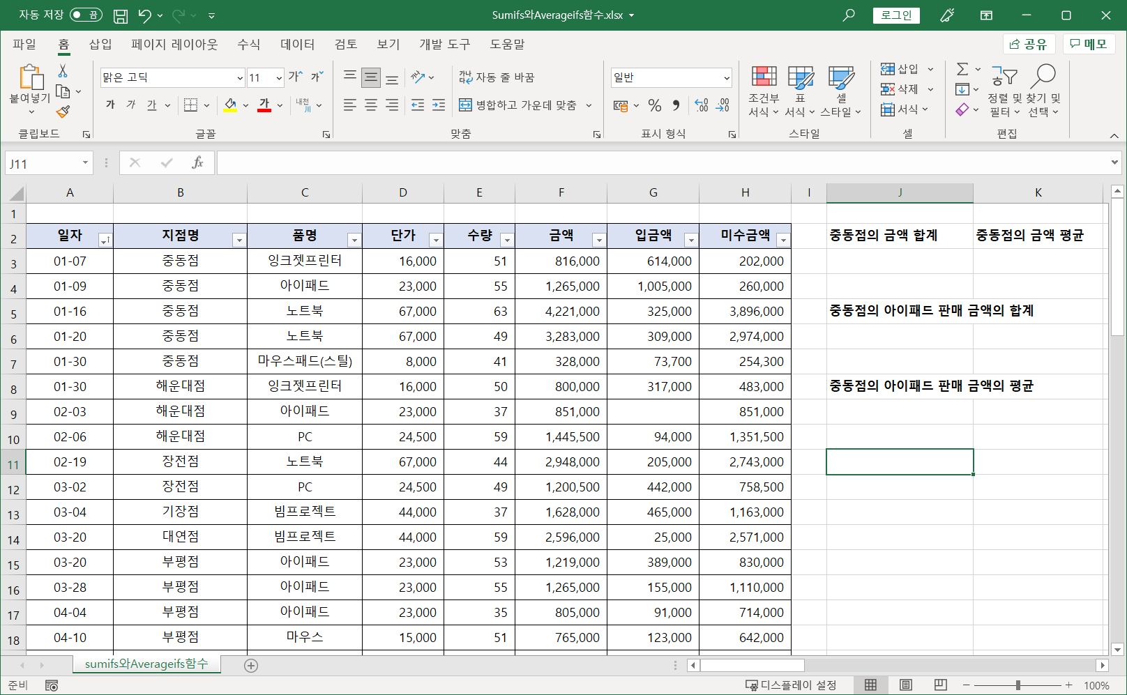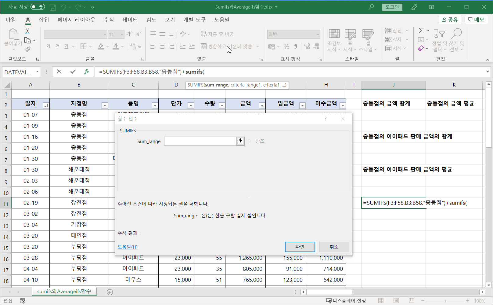 [J11] 셀에 커서를 두고 SUMIFS 함수를 적어 지점명이 '중동점'인 금액의 합을 구합니다.