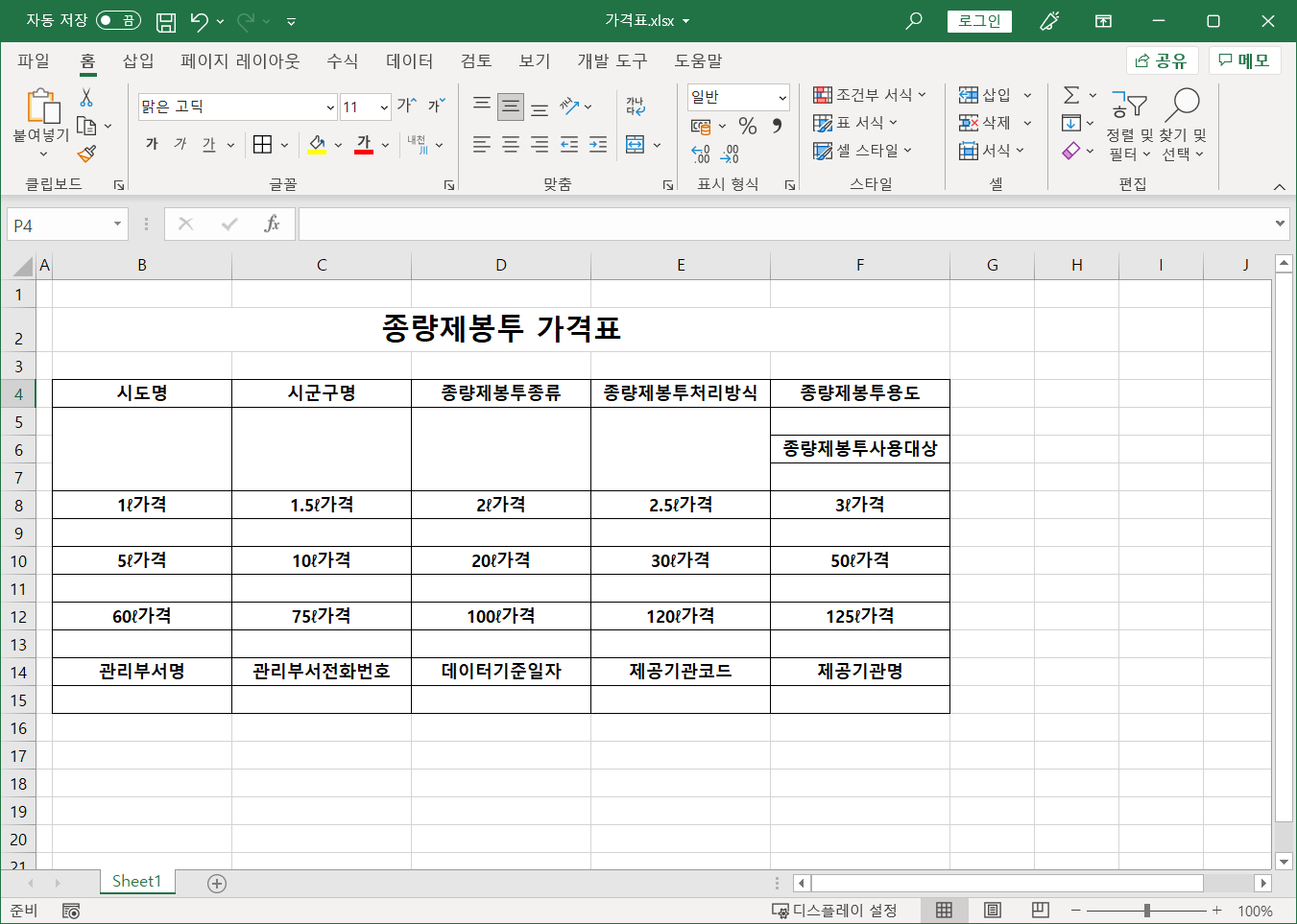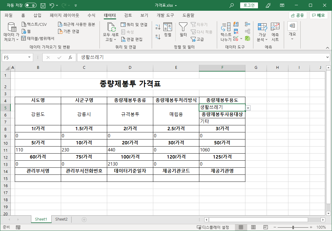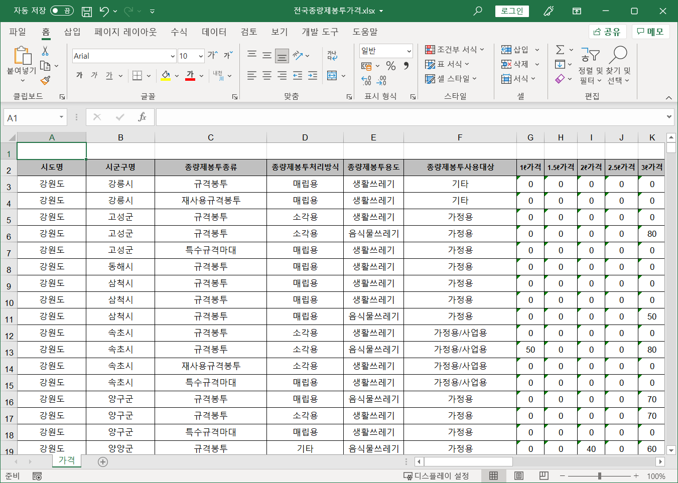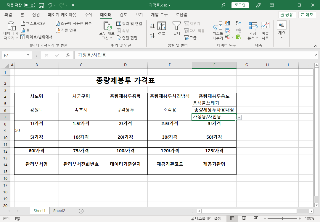 가격표.xlsx 파일은 전국종량제봉투가격 중 선택한 지자체 봉투 가격을 보여주는 파일입니다.