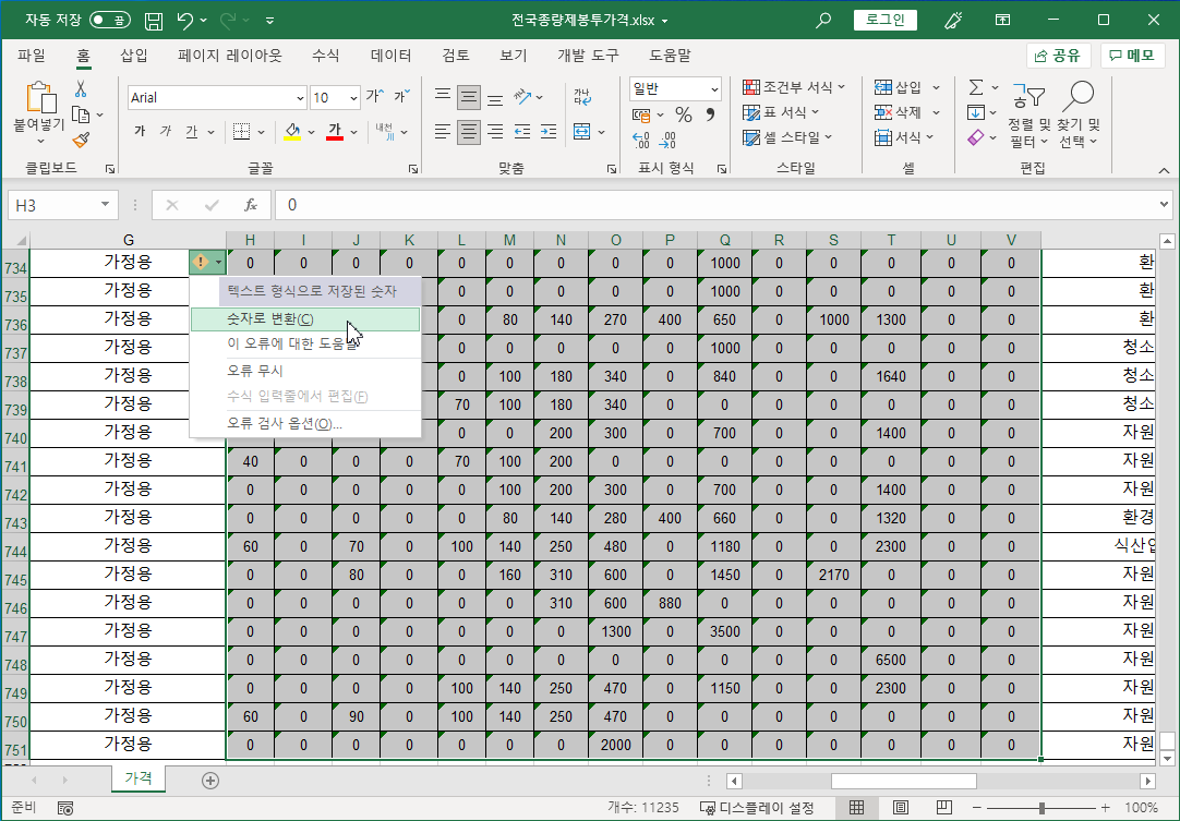 전국종량제봉투가격 파일 [H3:V751] 셀 범위를 선택하고, 선택한 영역 왼쪽 위 노란색 느낌표 표시를 눌러 [숫자로 변환]을 선택합니다. 그리고 저장합니다.