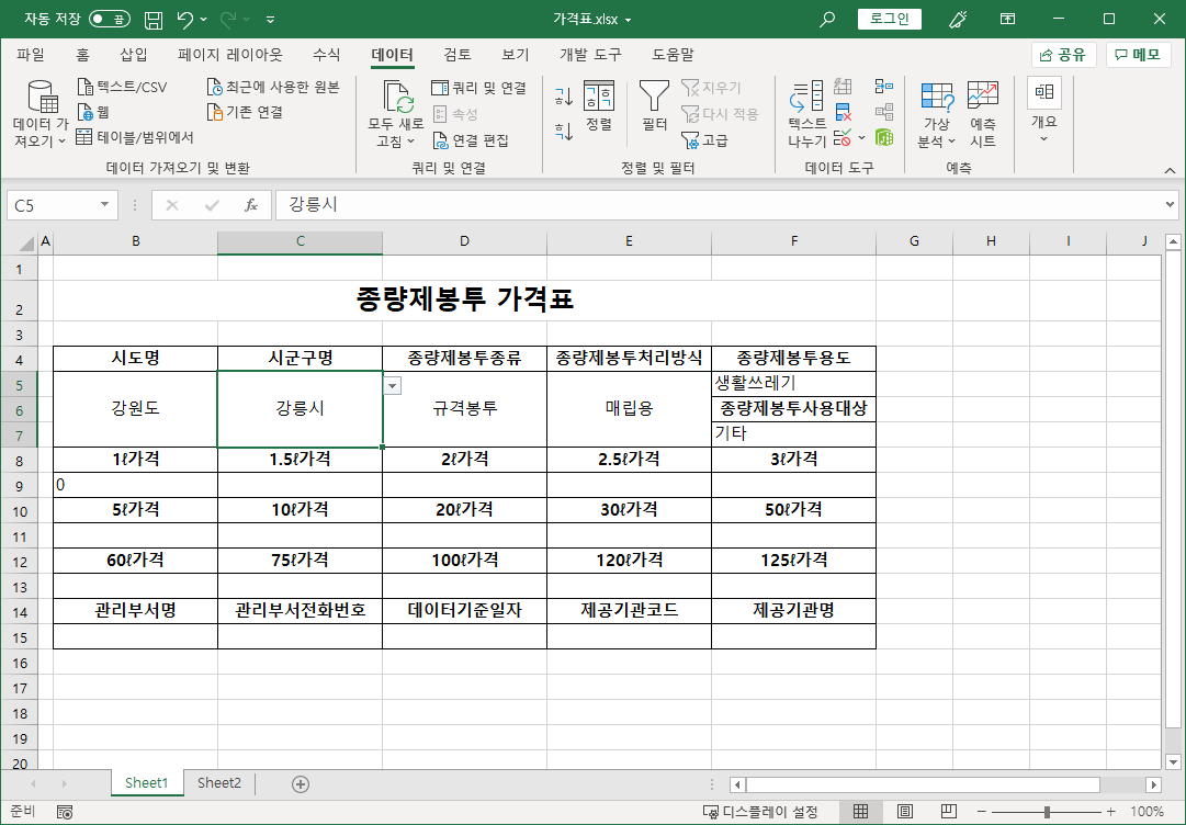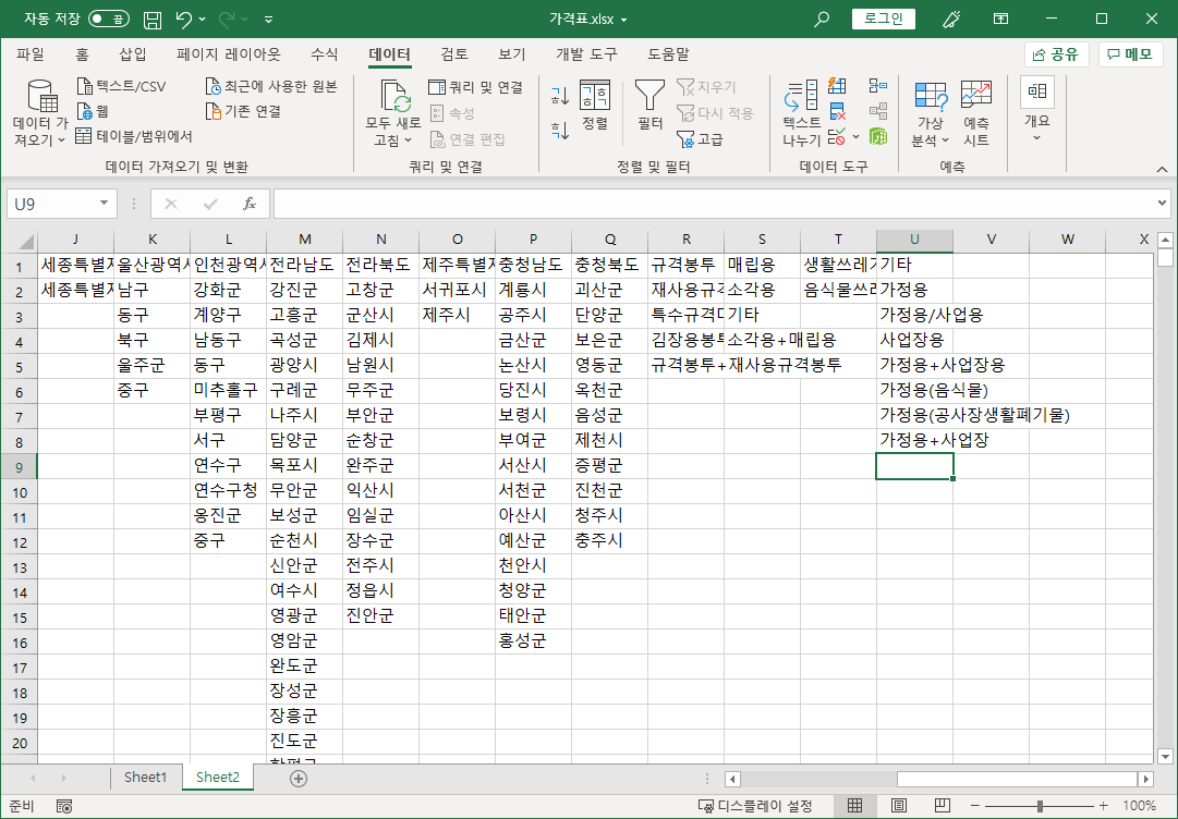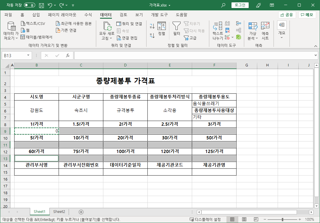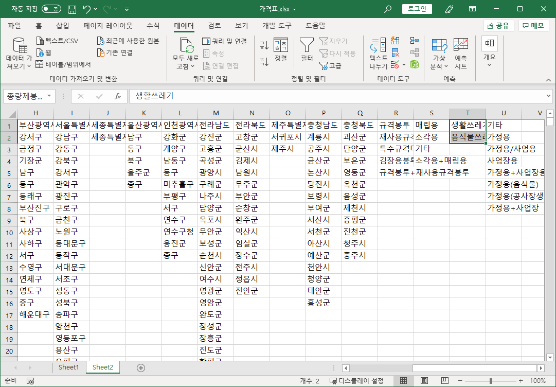 먼저 전국종량제봉투가격 파일에서 필요한 작업을 합니다.