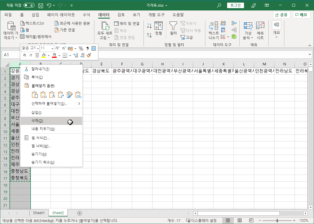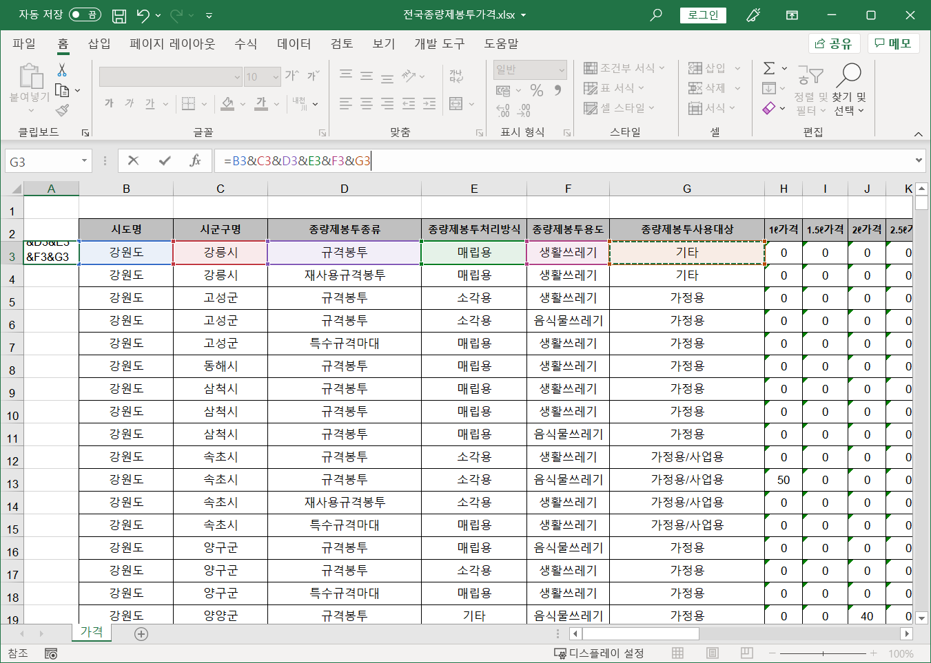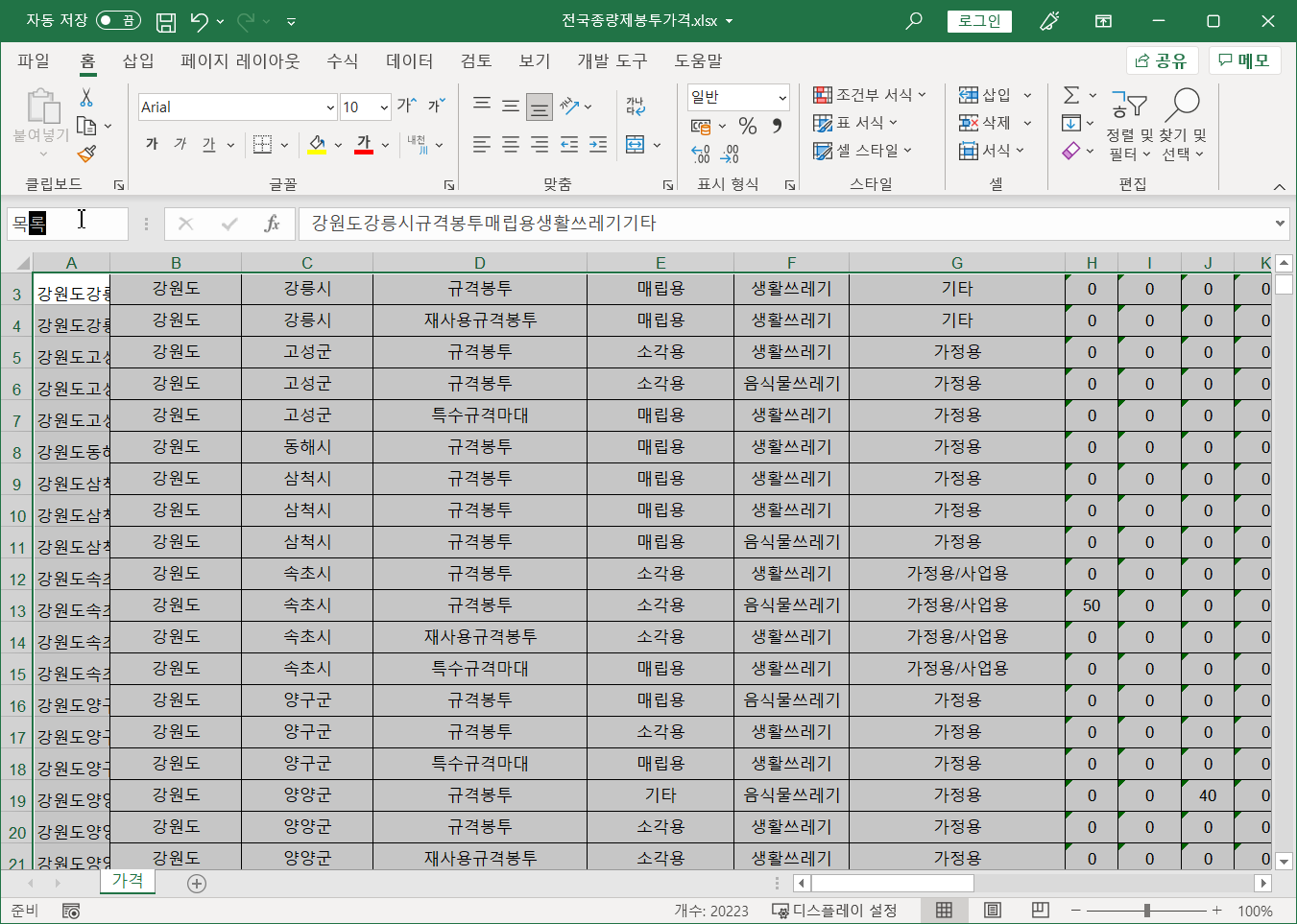 먼저 전국종량제봉투가격 파일에서 필요한 작업을 합니다.