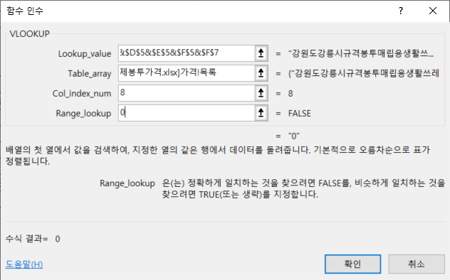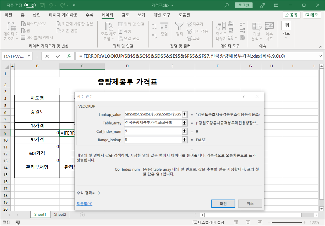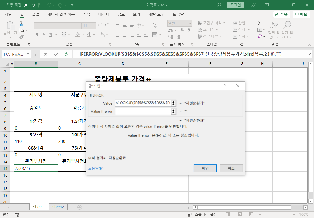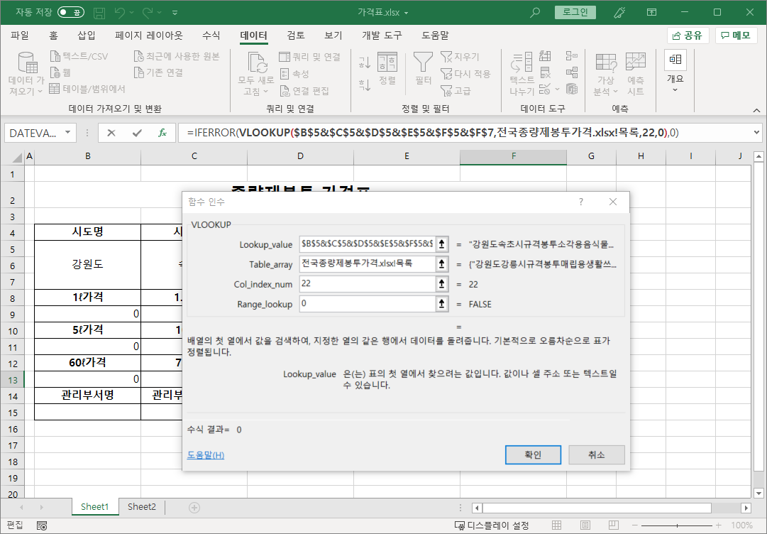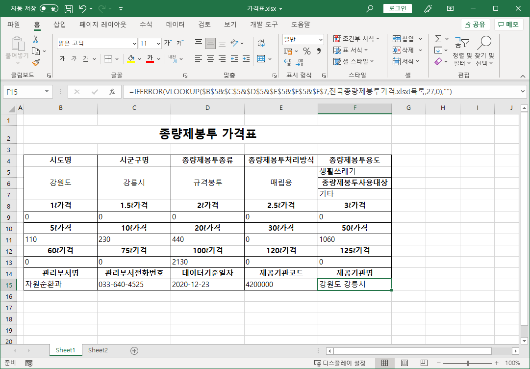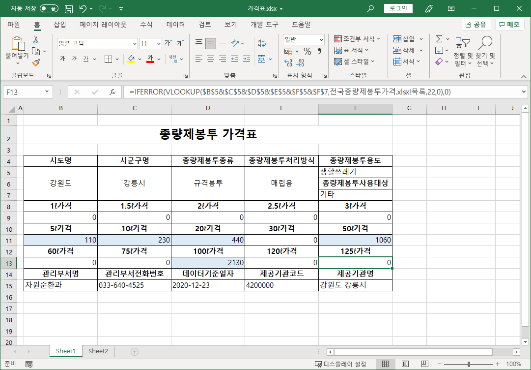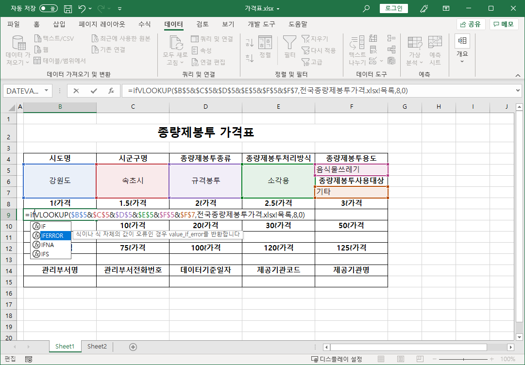 =IFERROR(VLOOKUP($B$5&$C$5&$D$5&$E$5&$F$5&$F$7,전국종량제봉투가격.xlsx!목록,8,0),0)