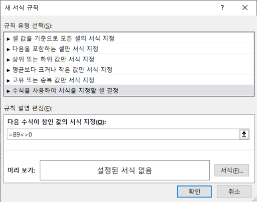 '수식을 사용하여 서식을 지정할 셀 결정'을 선택하고 [다음 수식이 참인 값의 서식 지정]에 =B9<>0을 입력합니다.