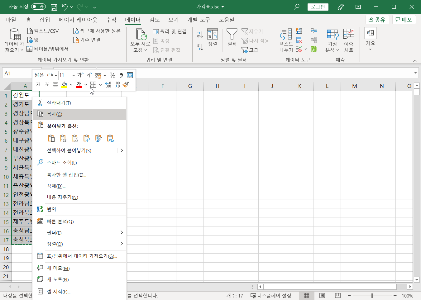 [A1:A17] 셀 범위를 복사합니다.