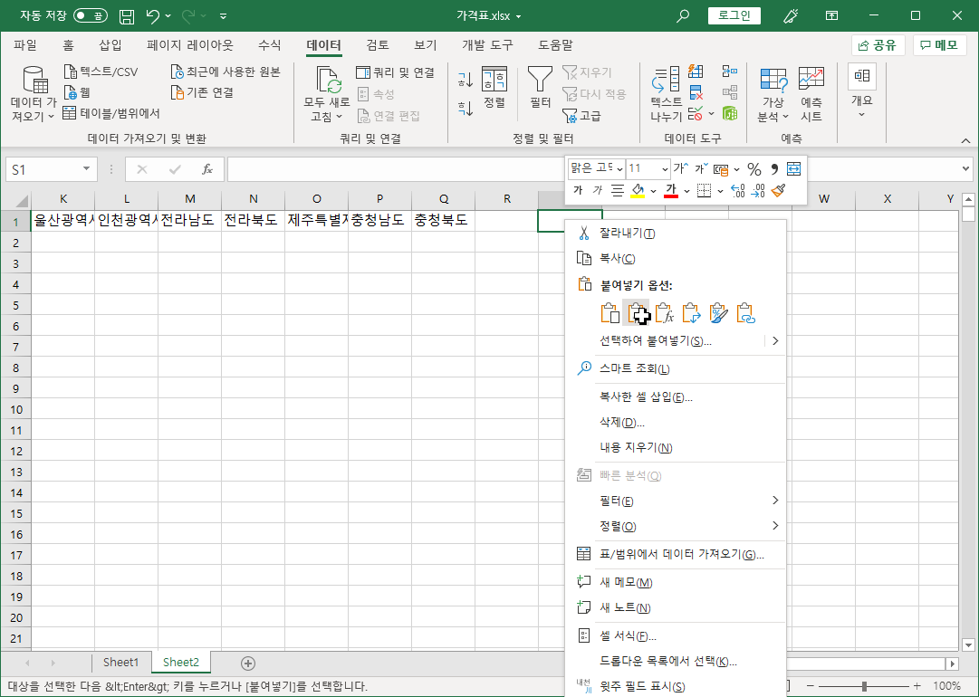 전국종량제봉투가격 파일 [B3:C751] 셀 범위를 선택해 복사하고, 가격표 파일 Sheet2 시트 [S1] 셀에 [선택하여 붙여넣기-값]을 선택해 붙여넣습니다.