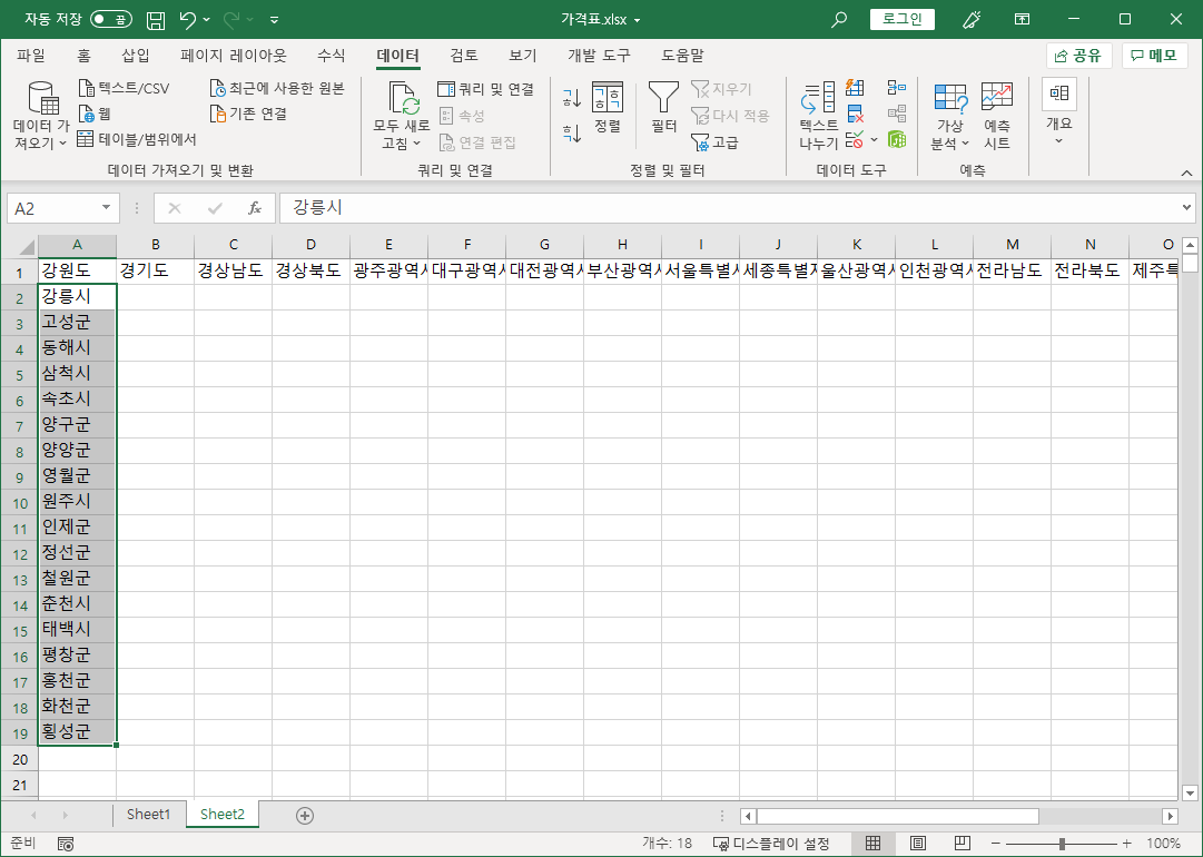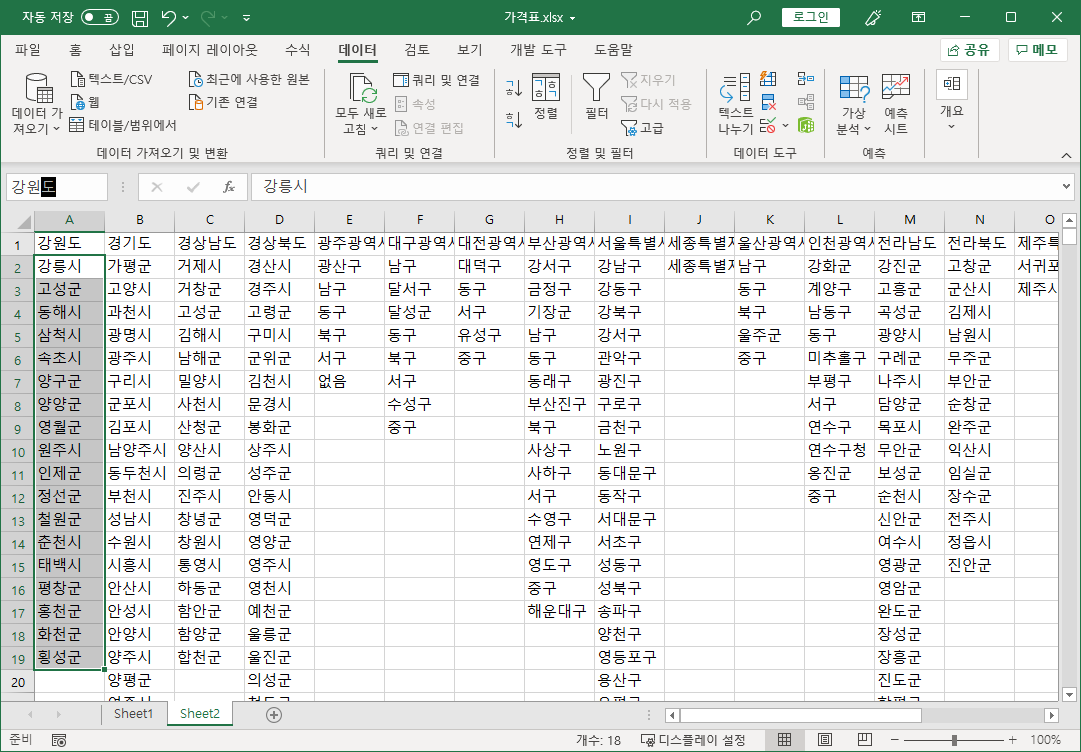 [T1:T18] 셀 범위 강원도에 해당하는 부분만 범위 선택해서 [잘라내기]하고 [A1] 셀 강원도 아래인 [A2] 셀에 붙여넣기 합니다.