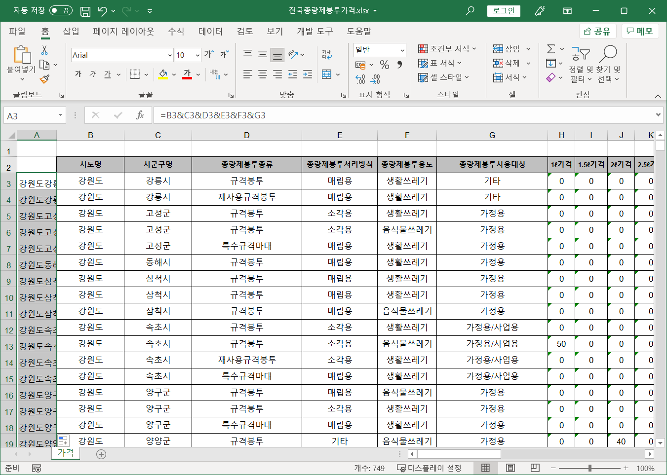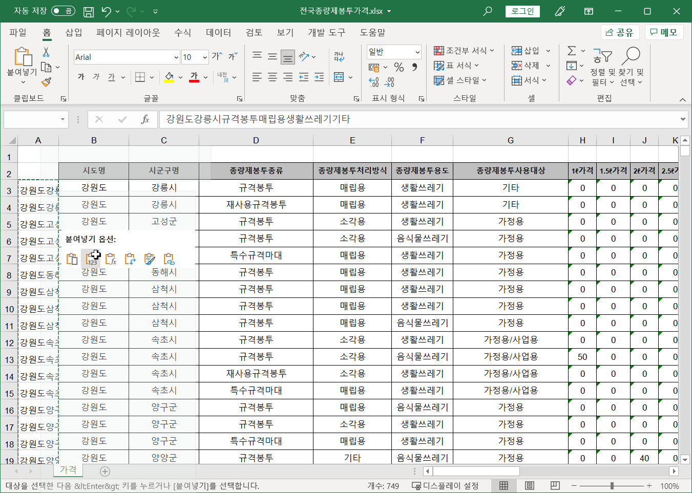 전국종량제봉투가격 파일 [B3:B751] 셀 범위를 복사해서 가격표 파일 Sheet2 시트 [A1] 셀에 [값]으로 붙여넣습니다.