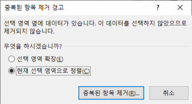 '현재 선택 영역으로 정렬'을 선택하고 [중복된 항목 제거]를 클릭합니다.