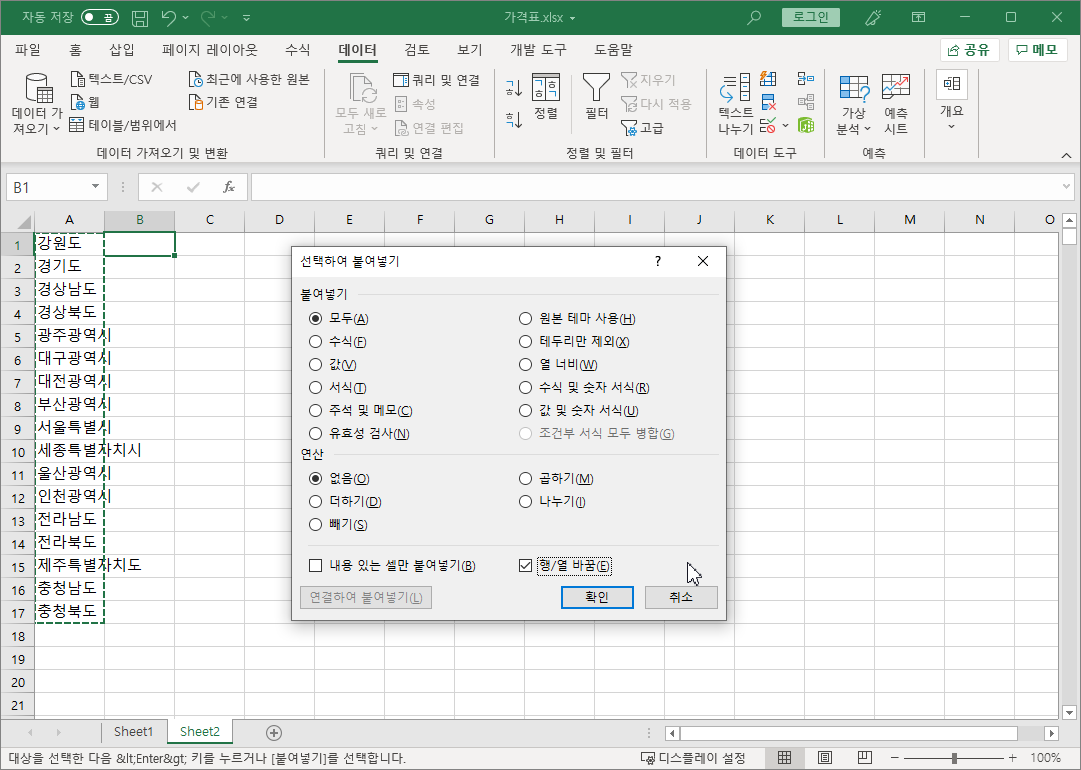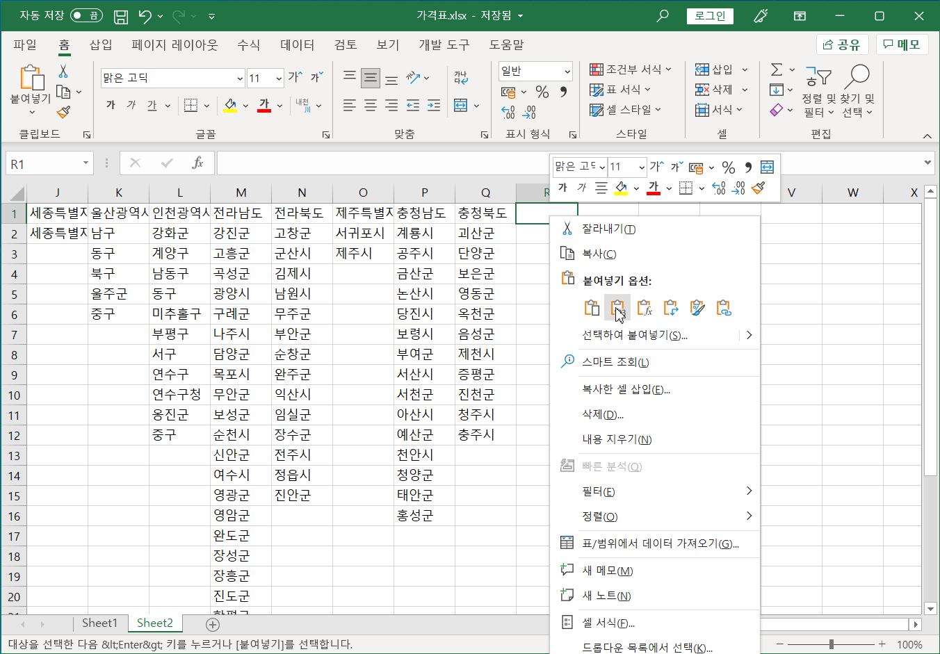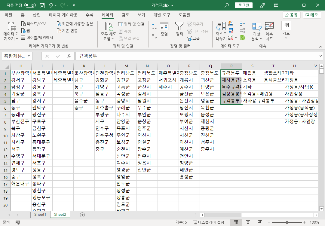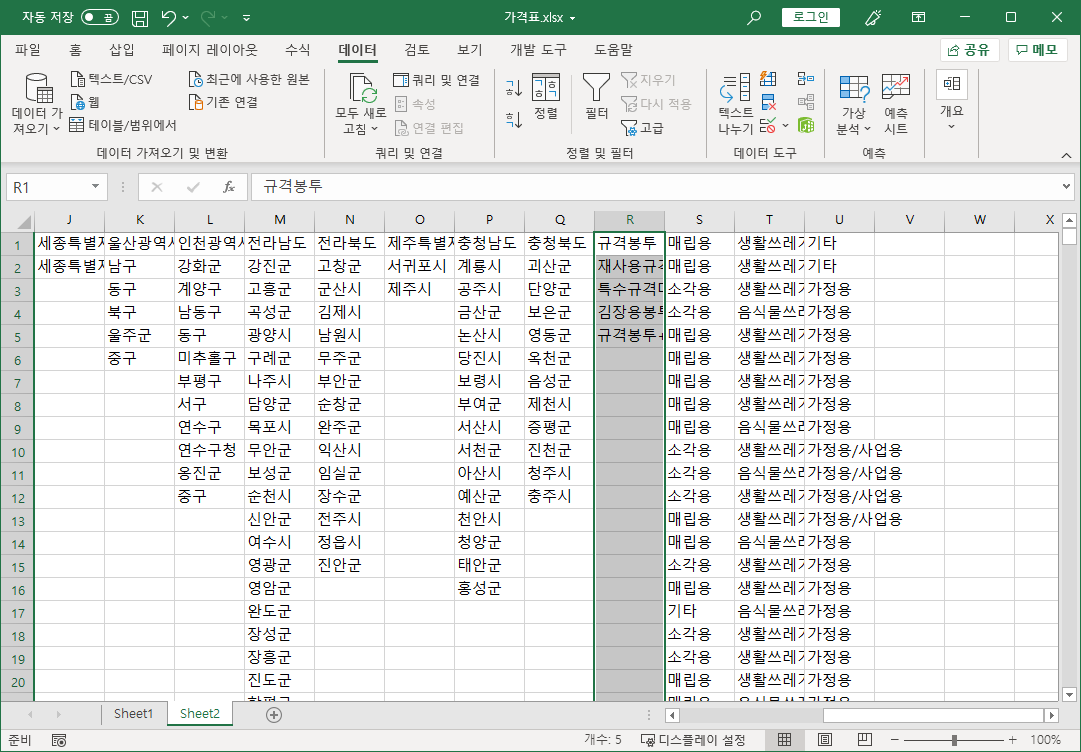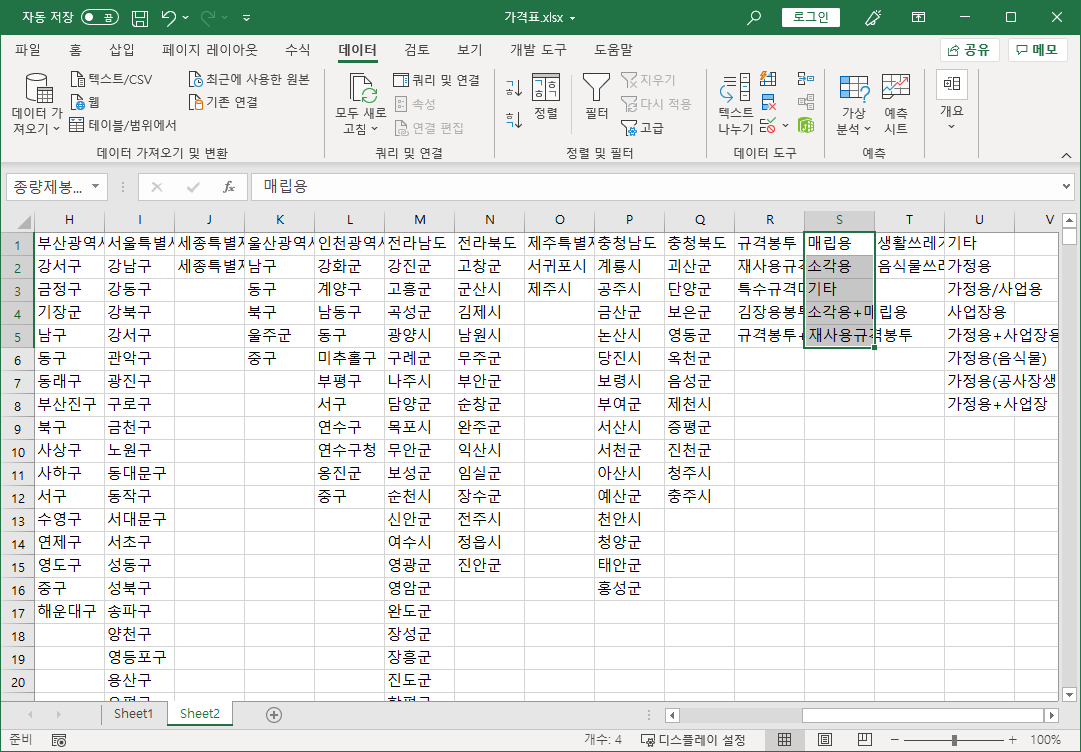 전국종량제봉투가격 파일 [D3:G751] 셀 범위를 선택해 복사하고, 가격표 파일 Sheet2 시트 [R1] 셀을 선택하고 [선택하여 붙여넣기-값]으로 붙여넣습니다.
