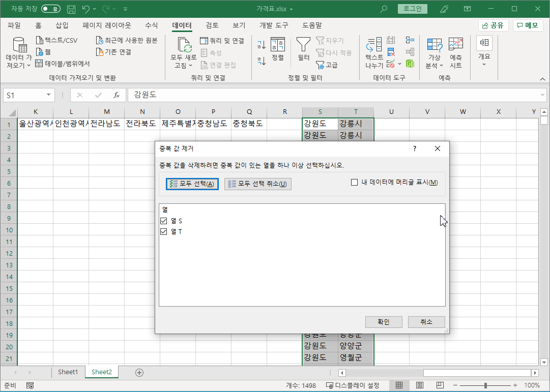 같은 방법으로 S, T, U열도 중복 값을 제거합니다.