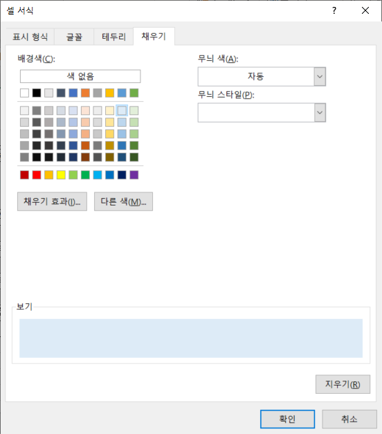 [서식]을 클릭해서 [채우기] 탭에서 적당한 색을 선택합니다.