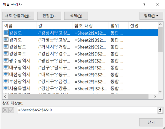 그래서 이름 정의할 때도 시도명에 해당하는 시군구명을 따로 시도명으로 이름 정의해 두었습니다.