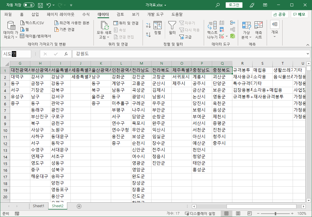 나머지 시군구명도 잘라내기해서 해당 시도명 아래 붙여넣습니다.