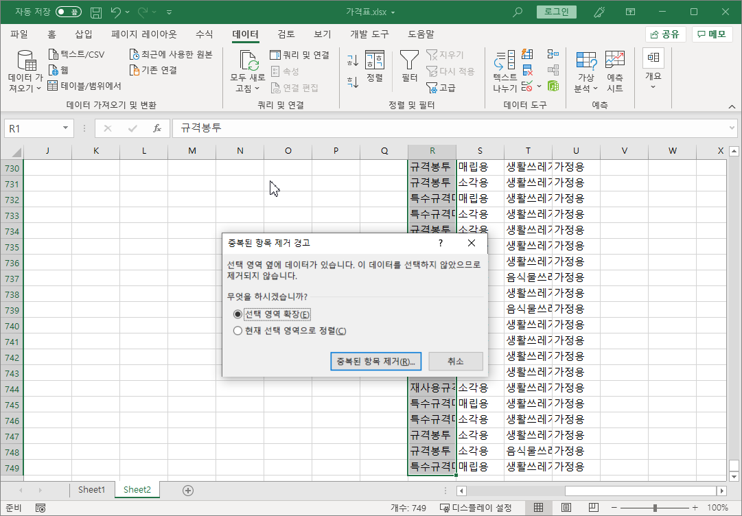 이 경고창이 나타나는 이유는 [R1:R751] 셀 범위와 연속된 다른 셀들이 있는데, 다른 셀들을 같이 범위 선택하지 않았기 때문에 '혹시 범위를 잘못선택하지 않았니?' 하며 과한 친절을 베푼 것입니다.