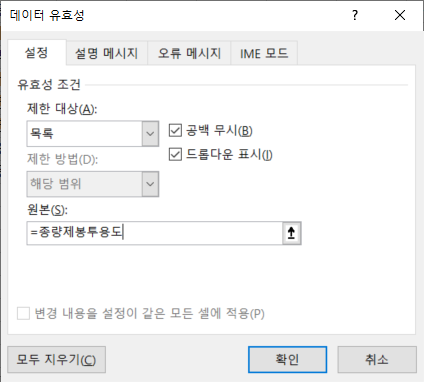 [E5] 셀에는 [원본]에 =종량제봉투처리방식을 입력하고 [확인]을 클릭합니다.